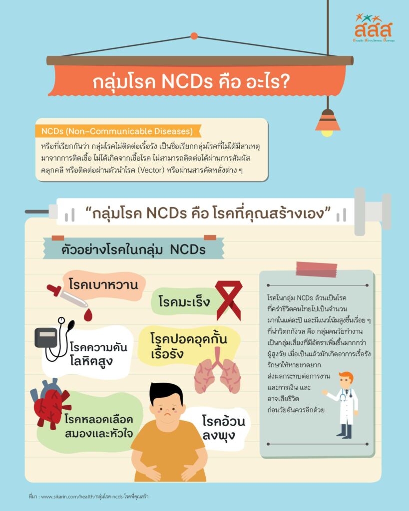 สำนักงานกองทุนสนับสนุนการสร้างเสริมสุขภาพ แนะนำกลุ่มโรค NCDs (Non-Communicable Diseases) หรือที่เรียกกันว่า กลุ่มโรคไม่ติดต่อเรื้อรัง เป็นชื่อเรียกกลุ่มโรคที่ไม่ได้มีสาเหตุ มาจากการติดเชื้อ ไม่ได้เกิดจากเชื้อโรค ไม่สามารถติดต่อผ่านการสัมผัส คลุกคลี หรือติดต่อผ่านตัวนําโรค (Vector) หรือผ่านสารคัดหลั่งต่างๆ โรคในกลุ่ม NCDs คร่าชีวิตคนไทยจํานวนมากในแต่ละปี และมีแนวโน้มสูงขึ้นเรื่อยๆ ที่น่าวิตกกังวล คือ กลุ่มคนวัยทํางาน เป็นกลุ่มเสี่ยงที่มีอัตราเพิ่มขึ้น ผู้สูงวัย เมื่อเป็นแล้วมักเกิดอาการเรื้อรัง รักษาให้หายขาดยาก ส่งผลกระทบต่อการงาน และการเงิน และอาจเสียชีวิต ก่อนวัยอันควรอีกด้วย