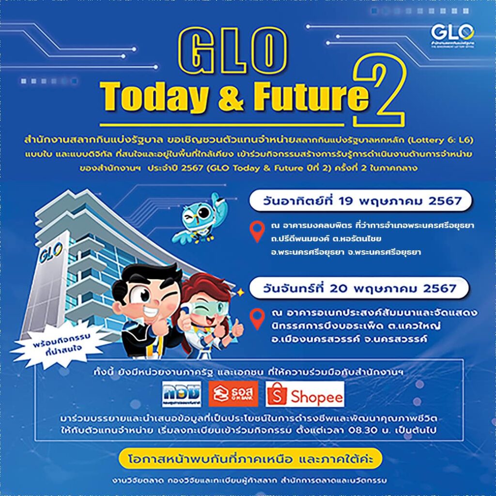 สำนักงานสลากกินแบ่งรัฐบาล (GLO) ขอเชิญชวนตัวแทนจำหน่ายสลากกินแบ่งรัฐบาลหกหลัก (Lottery 6: L6) แบบใบ และแบบดิจิทัล ที่สนใจและอยู่ในพื้นที่ใกล้เคียง เข้าร่วมกิจกรรม GLO Today & Future ปีที่ 2 เพื่อสร้างการรับรู้การดำเนินงานด้านการจำหน่ายของสำนักงานฯ ประจำปี 2567 ภาคกลาง
