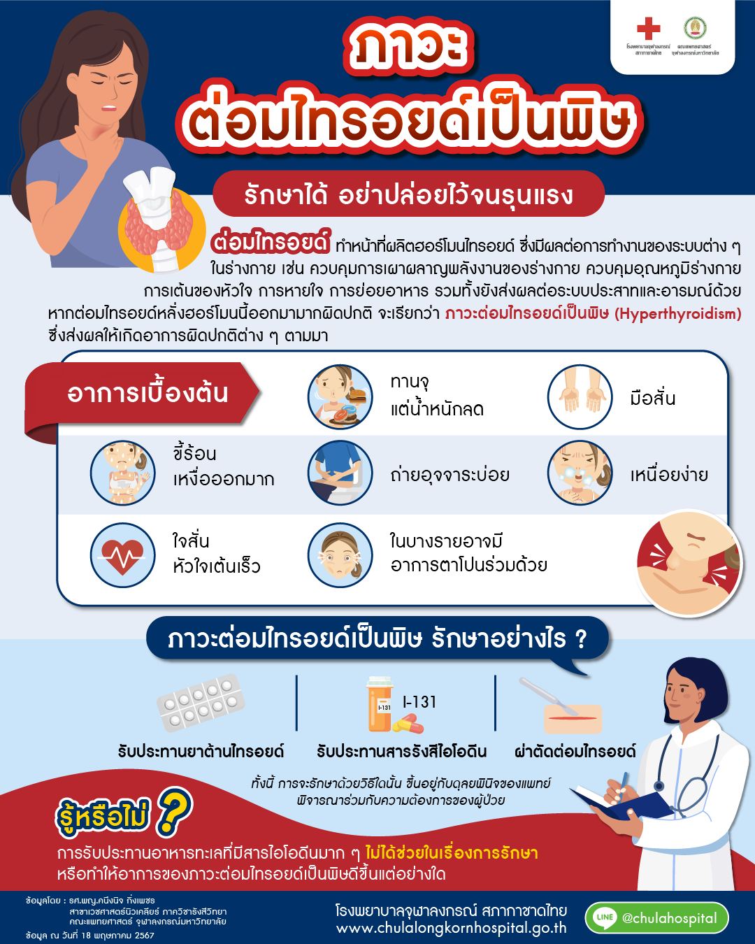 โรงพยาบาลจุฬาลงกรณ์ สภากาชาดไทย แนะนำภาวะต่อมไทรอยด์เป็นพิษ รักษาได้ อย่าปล่อยไว้จนรุนแรง โดยต่อมไทรอยด์ ทำหน้าที่ผลิตฮอร์โมนไทรอยด์ ซึ่งมีผลต่อการทำงานของระบบต่าง ๆ ในร่างกาย เช่น ควบคุมการเผาผลาญพลังงานของร่างกาย ควบคุมอุณหภูมิร่างกาย การเต้นของหัวใจ การหายใจ การย่อยอาหาร รวมทั้งยังส่งผลต่อระบบประสาทและอารมณ์ด้วย หากต่อมไทรอยด์หลั่งฮอร์โมนนี้ออกมามากผิดปกติ จะเรียกว่า ภาวะต่อมไทรอยด์เป็นพิษ (Hyperthyroidism) ซึ่งส่งผลให้เกิดอาการผิดปกติต่าง ๆ ตามมา