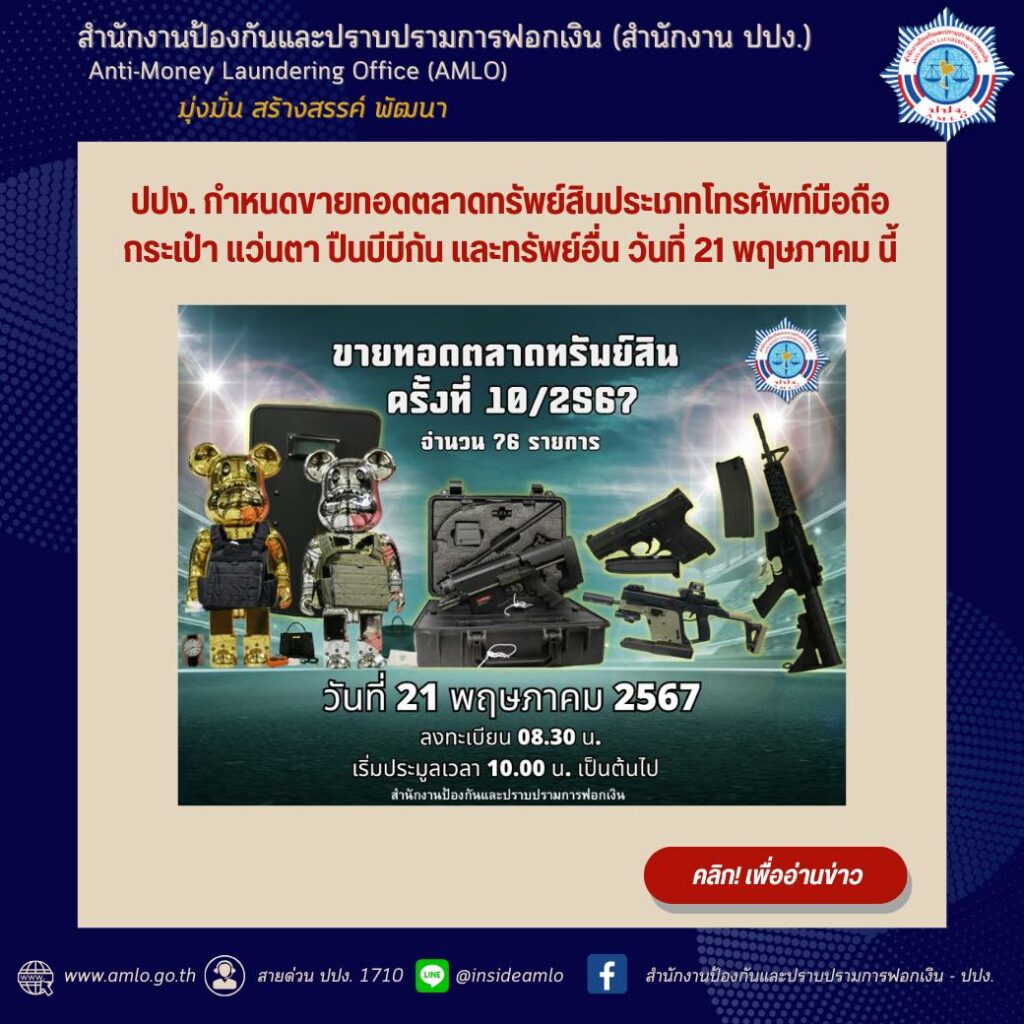 ปปง. ขายทอดตลาดทรัพย์สิน ครั้งที่ 10/2567 จำนวน 76 รายการ วันที่ 21 พฤษภาคม 2567