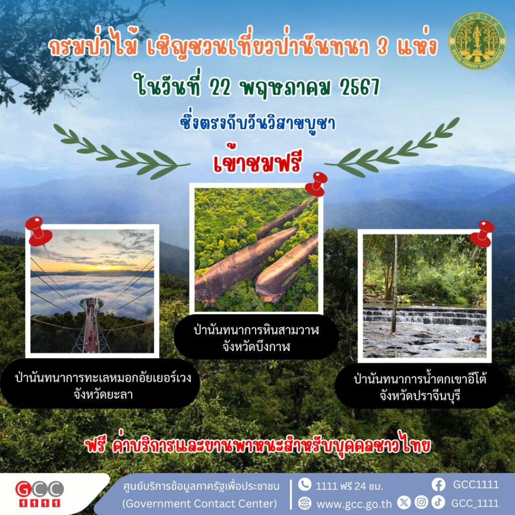 กรมป่าไม้ เชิญชวนเที่ยวป่านันทนา 3 แห่ง ในวันที่ 22 พฤษภาคม 2567 เข้าชมฟรี