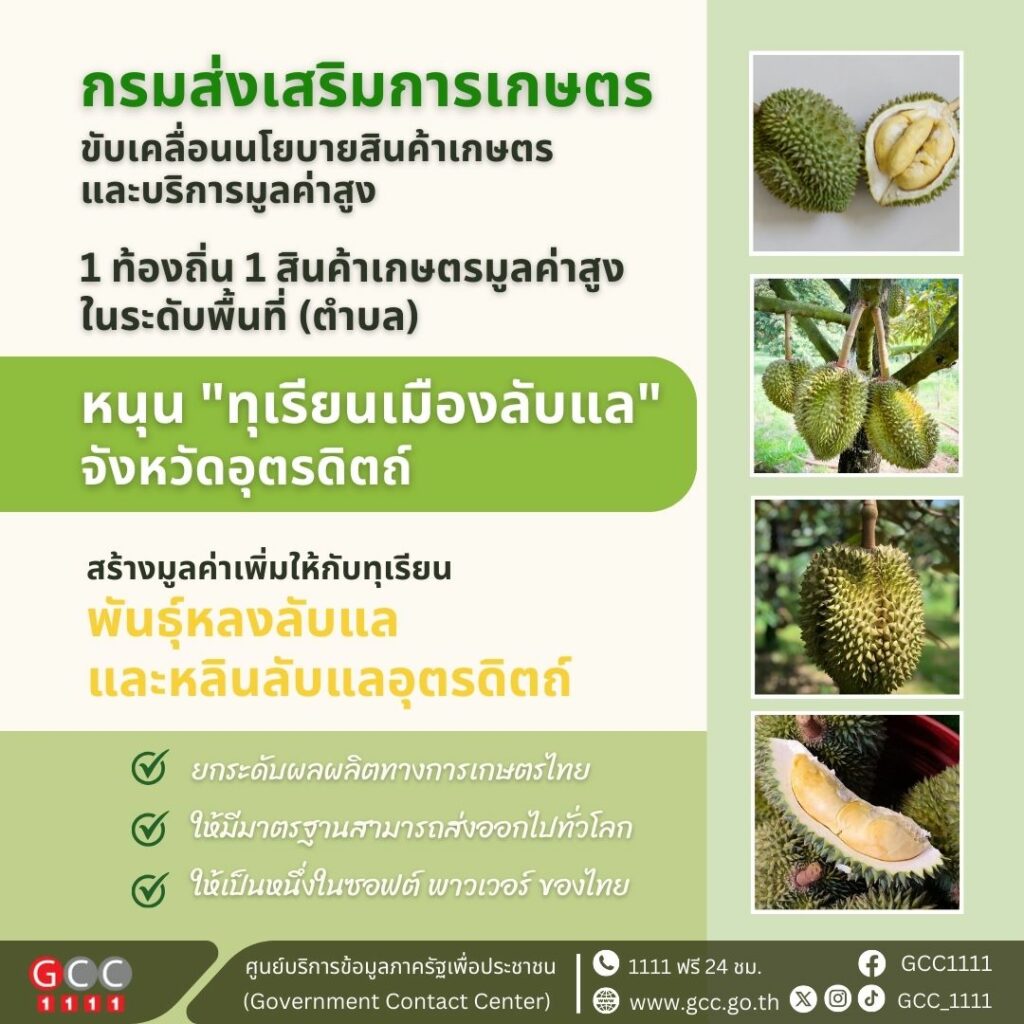 กรมส่งเสริมการเกษตร หนุน “ทุเรียนเมืองลับแล” จังหวัดอุตรดิตถ์ 1 ท้องถิ่น 1 สินค้าเกษตรมูลค่าสูง