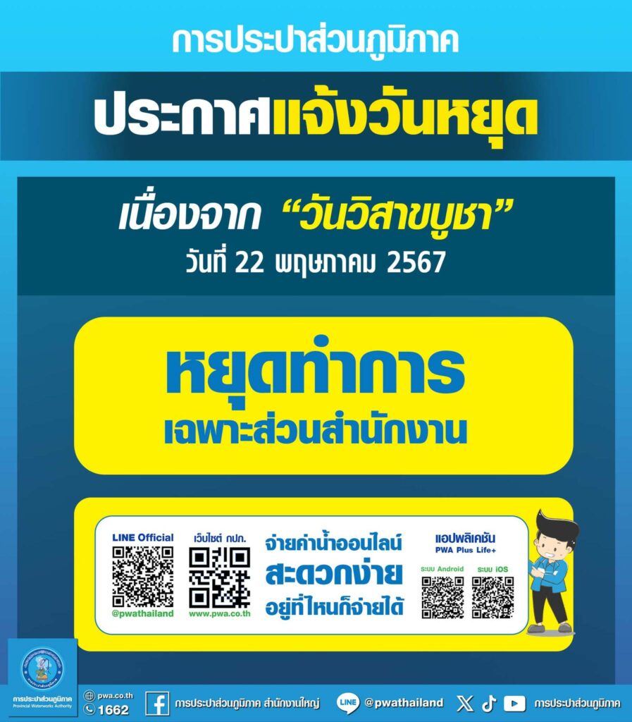 การประปาส่วนภูมิภาค แจ้งปิดทำการเฉพาะส่วนสำนักงาน วันที่ 22 พฤษภาคม 2567 เนื่องในวันวิสาขบูชา ขอแนะนำช่องทางออนไลน์สำหรับชำระค่าน้ำและทำธุรกรรมต่าง ๆ ดังนี้ PWA LINE OA : @pwathailand https://line.me/ti/p/@pwathailand Website : www.pwa.co.th PWA Plus Life บริการประปาครบ จบในแอปฯ เดียว หากลูกค้าประสบปัญหาการใช้บริการหรือต้องการสอบถามข้อมูลเพิ่มเติม สามารถติดต่อได้ที่ PWA Contact Center 1662 ตลอด 24 ชั่วโมง
