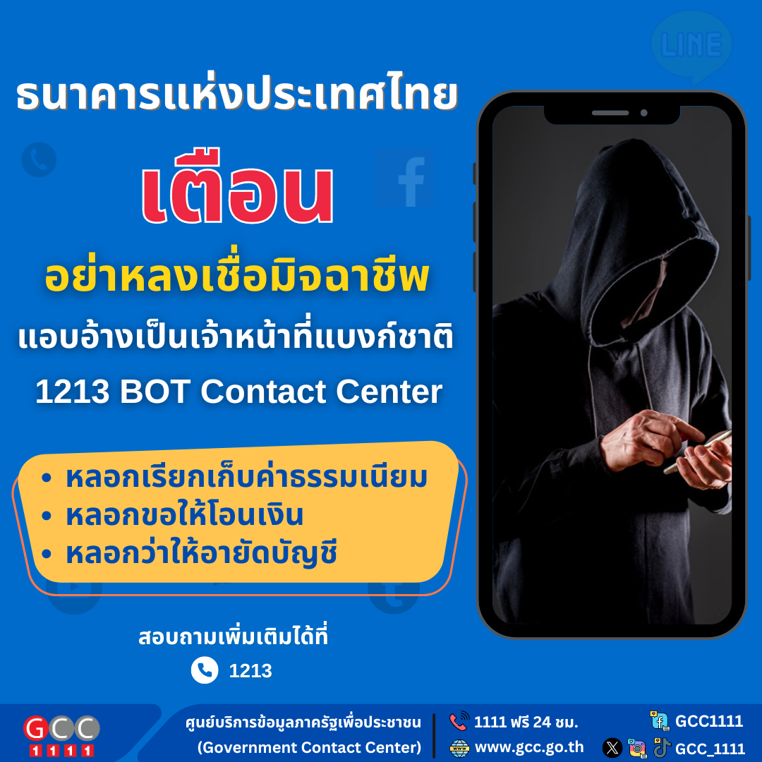 ธนาคารแห่งประเทศไทย เตือนภัย อย่าหลงเชื่อมิจฉาชีพ แอบอ้างเป็นเจ้าหน้าที่แบงก์ชาติ 1213 BOT Contact Center