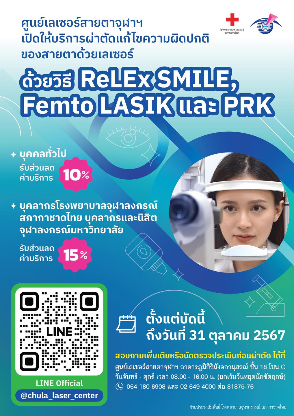 ศูนย์เลเซอร์สายตาจุฬาฯ เปิดให้บริการผ่าตัดแก้ไขความผิดปกติของสายตาด้วยเลเซอร์ ด้วยวิธี ReLEx SMILE, Femto LASIK และ PRK