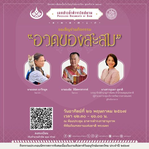 กรมศิลปากร กระทรวงวัฒนธรรม ขอเชิญผู้สนใจร่วมโครงการนิทรรศการพิเศษเนื่องในวันอนุรักษ์มรดกไทย ประจำปี 2567 เรื่อง เอกสารล้ำค่าจารึกสยาม กิจกรรม “อวดของสะสม : หนังสือเก่า/ลายพระหัตถ์ ร.5 ตั้งพระนามพระธิดา กับแผนที่กรุงเทพฯ” ของนายเอนก นาวิกมูล และ นายธงชัย ลิขิตพรสวรรค์ ในวันอาทิตย์ที่ 26 พฤษภาคม 2567 เวลา 12.30 – 16.00 น. ณ ห้องประชุมอาคารดำรงราชานุภาพ พิพิธภัณฑสถานแห่งชาติ พระนคร ผู้สนใจสามารถลงทะเบียนเข้าร่วมงานตาม QR Code นี้ รับจำนวนจำกัด 110 ท่าน สามารถลงทะเบียนได้ตั้งแต่บัดนี้ หรือจนกว่าจะเต็ม