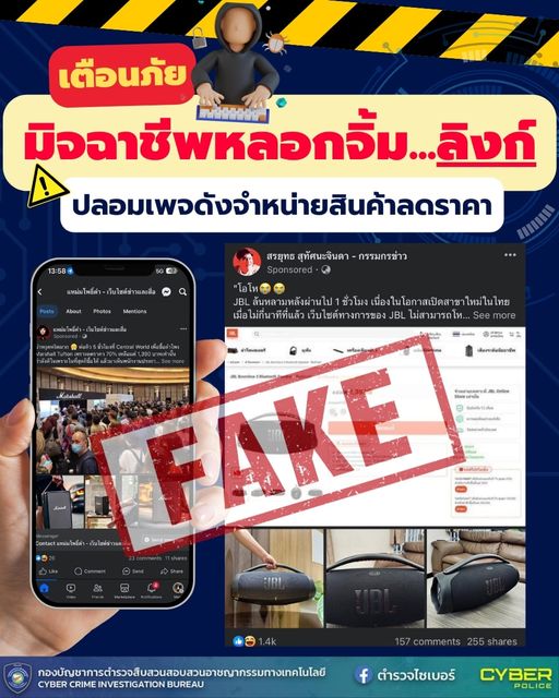 สืบเนื่องจากช่วงนี้พบมิจฉาชีพสร้างเฟซบุ๊กแฟนเพจปลอมขึ้นมาเลียนแบบเพจดังต่าง ๆ แล้วบูสต์โพสต์ด้วยการยิงโฆษณาพร้อมลงข้อความขายสินค้าแบรนด์ดังต่าง ๆ ไม่ว่าจะเป็นเครื่องใช้ไฟฟ้า ของสะสมประเภท ARTTOY รวมทั้งโรงแรมที่พัก หรือ สินค้าและบริการประเภทอื่น ๆ ที่ประชาชนให้ความสนใจ พร้อมแนบลิงก์ปลอมให้กด
