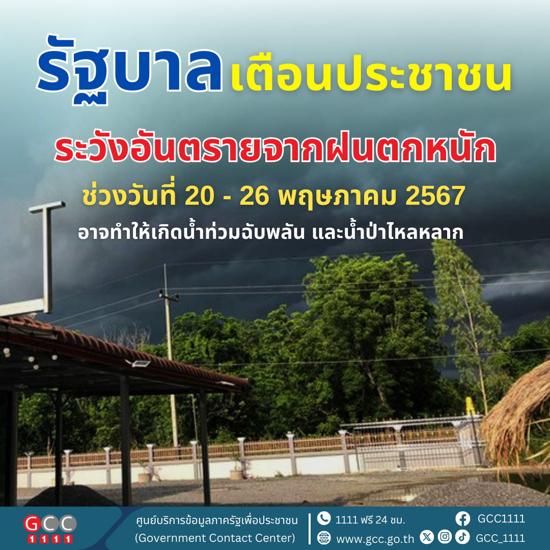 รัฐบาล เตือนประชาชนระวังอันตรายจากฝนตกหนัก หลังกรมอุตุฯ ได้ออกประกาศฉบับที่ 1 เตือนเฝ้าระวังฝนตกหนักถึงหนักมาก ในช่วง 20-26 พ.ค. ในภาคเหนือ-ภาคกลาง-ภาคใต้ และฝั่งตะวันตก ขอให้เตรียมรับมือกับสถานการณ์ และขอให้ประชาชนระวังอันตรายจากฝนตกหนักถึงหนักมากและฝนที่ตกสะสมซึ่งอาจทำให้เกิดน้ำท่วมฉับพลัน และน้ำป่าไหลหลาก โดยเฉพาะพื้นที่ลาดเชิงเขาใกล้ทางน้ำไหลผ่านและพื้นที่ลุ่ม รวมทั้งเพิ่มความระมัดระวังในการสัญจรผ่านบริเวณที่มีฝนฟ้าคะนอง