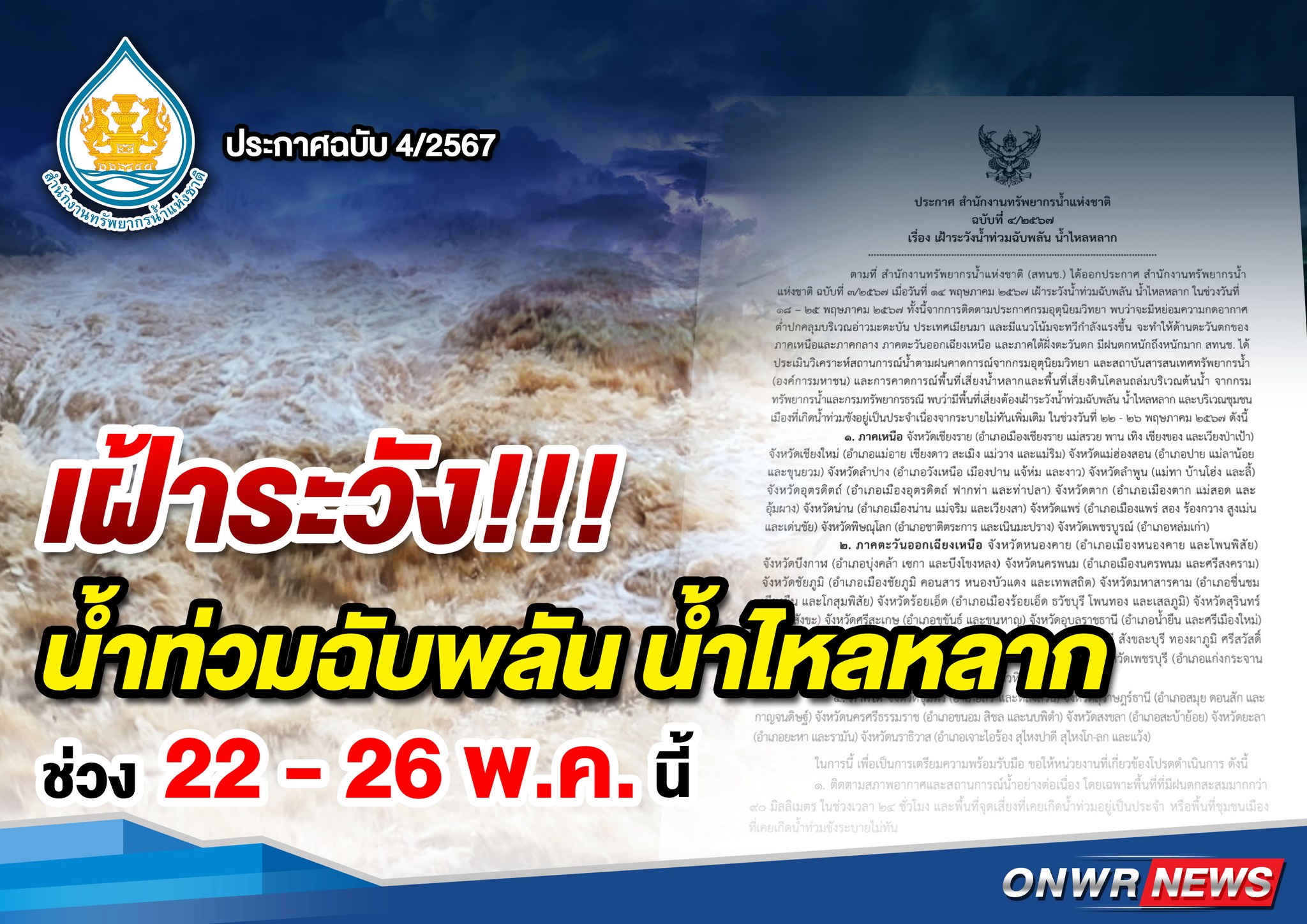 สำนักงานทรัพยากรน้ำแห่งชาติ เตือนเฝ้าระวังน้ำท่วมฉับพลัน น้ำไหลหลาก และบริเวณชุมชนเมืองที่เกิดน้ำท่วมขังอยู่เป็นประจำเนื่องจากระบายไม่ทันเพิ่มเติม ในช่วงวันที่ 22 – 26 พฤษภาคม 2567