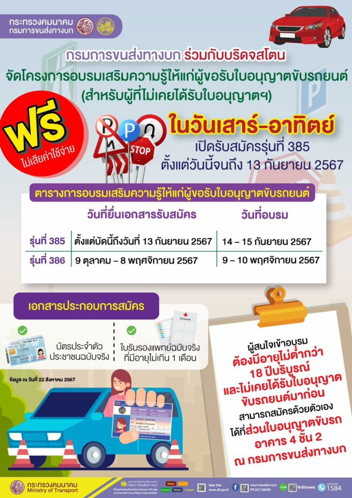 นายเสกสม อัครพันธุ์ รองอธิบดีกรมการขนส่งทางบก และโฆษกกรมการขนส่งทางบก กล่าวว่า กรมการขนส่งทางบกร่วมกับ บริษัท ไทยบริดจสโตน จำกัด จัดโครงการอบรมเสริมความรู้ให้แก่ผู้ขอรับใบอนุญาตขับรถยนต์ ในวันเสาร์ – อาทิตย์ เพื่อเสริมสร้างความรู้ความเข้าใจในการขับรถยนต์ที่ถูกต้องตามกฎหมายและสร้างความตระหนักถึงการใช้รถใช้ถนนที่ปลอดภัย โดยรุ่นที่ 384 จะจัดอบรมในวันที่ 15 – 16 มิถุนายน 2567 ผู้สนใจเข้าอบรมต้องมีอายุไม่ต่ำกว่า 18 ปีบริบูรณ์ และไม่เคยได้รับใบอนุญาตขับรถยนต์มาก่อน สามารถสมัครด้วยตัวเองได้ที่ส่วนใบอนุญาตขับรถ อาคาร 4 ชั้น 2 ณ กรมการขนส่งทางบก ตั้งแต่บัดนี้จนถึงวันที่ 14 มิถุนายน 2567 พร้อมหลักฐาน ได้แก่ บัตรประจำตัวประชาชนฉบับจริง และใบรับรองแพทย์ฉบับจริงที่มีอายุไม่เกิน 1 เดือน และต้องสมัครด้วยตนเองเท่านั้น ฟรีไม่เสียค่าใช้จ่าย (ไม่รวมค่าออกบัตร) ทั้งนี้ การอบรมจะจัดขึ้นที่สำนักงานขนส่งกรุงเทพมหานครพื้นที่ 5 กรมการขนส่งทางบก จตุจักร เท่านั้น
