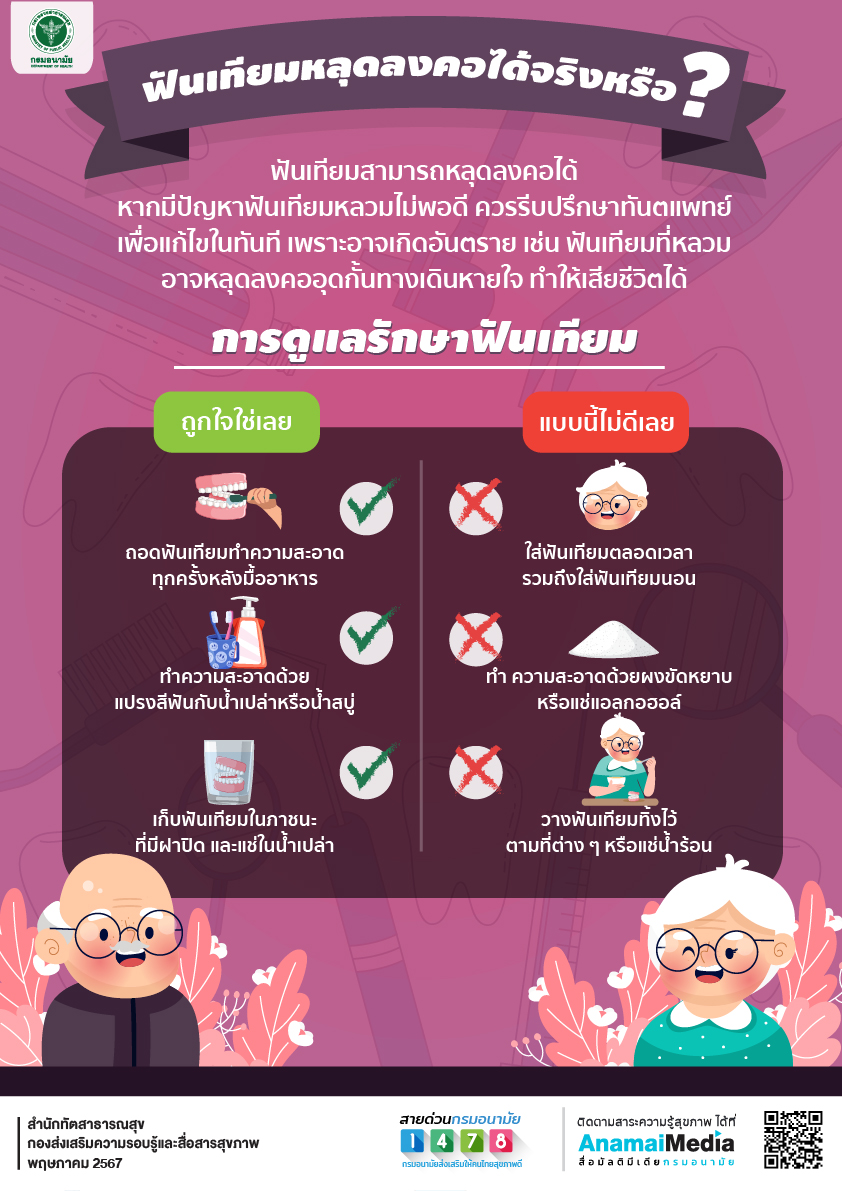 กรมอนามัย แนะนำฟันเทียมหลุดลงคอได้จริงหรือ โดยฟันเทียมสามารถหลุดลงคอได้ หากมีปัญหาฟันเทียมหลวม ไม่พอดี ควรรีบปรึกษาทันตแพทย์เพื่อแก้ไขในทันที เพราะอาจเกิดอันตราย เช่น ฟันเทียมที่หลวมอาจหลุดลงคออุดกั้นทางเดินหายใจ ทำให้เสียชีวิตได้