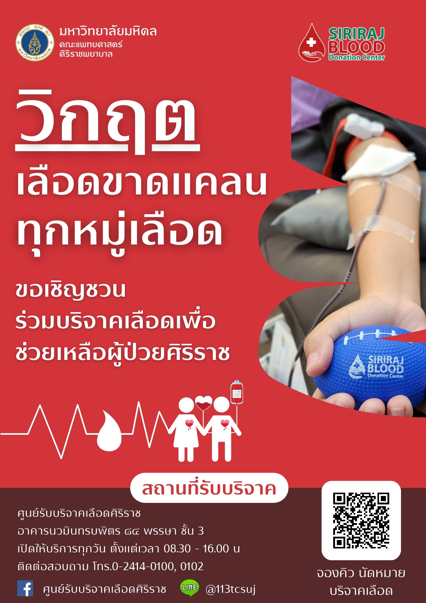 วิกฤตสถานการณ์เลือดขาดแคลนทุกหมู่เลือด ขอเชิญชวนประชาชนที่มีสุขภาพแข็งแรง อายุ 18 ปีบริบูณ์ขึ้นไป ร่วมบริจาคเลือดเพื่อช่วยเหลือผู้ป่วยศิริราช ณ ศูนย์รับบริจาคเลือดศิริราช อาคารนวมินทรบพิตร 84 พรรษา ชั้น 3 สามารถบริจาคได้ทุกวันไม่เวันวันหยุดนักขัตฤกษ์ ร่วมเป็นส่วนหนึ่งของผู้ให้ หนึ่งการให้ของท่าน ได้ส่งต่อพลังมหาศาลให้กับคนอีกมากมายศิริราช Ready To Share เราพร้อมสร้างสังคมที่มีคุณภาพและแบ่งโอกาสให้กับทุกคน