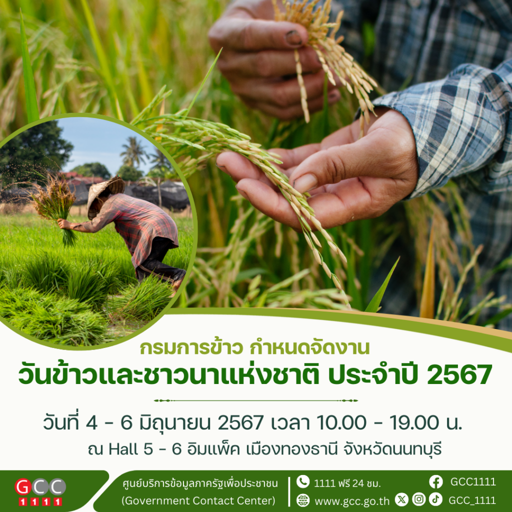 กรมการข้าว จัดงาน “วันข้าวและชาวนาแห่งชาติ ประจำปี 2567” ภายใต้แนวคิด “พระบารมีเกริกก้องหล้า สู่ผืนนาข้าวไทย ผสานเกษตรแนวใหม่ ชาวนาไทยยั่งยืน” ระหว่างวันที่ 4 – 6 มิถุนายน 2567 ตั้งแต่เวลา 10.00 – 19.00 น. ณ Hall 5 – 6 อิมแพ็ค เมืองทองธานี จังหวัดนนทบุรี