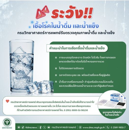 การบริโภคน้ำดื่มหรือน้ำแข็งที่ไม่สะอาด เป็นสาเหตุของโรคทางเดินอาหาร หรือโรคอาหารเป็นพิษ โคลิฟอร์มเป็นเชื้อบักเตรีชนิดหนึ่ง ซึ่งถ้าตรวจพบเชื้อโคลิฟอร์มปนเปื้อนในน้ำหรือน้ำแข็ง แสดงว่าน้ำและน้ำแข็งนั้นไม่สะอาด ไม่ควรนำมาบริโภค กรมวิทยาศาสตร์การแพทย์ได้พัฒนาชุดทดสอบโคลิฟอร์มในน้ำและน้ำแข็ง เพื่อให้สามารถนำไปตรวจเบื้องต้นด้วยตนเองนอกห้องปฏิบัติการ สามารถทราบผลภายใน 24 ชั่วโมง สอบถามรายละเอียดชุดทดสอบได้ที่ร้านค้าสวัสดิการกรมวิทยาศาสตร์การแพทย์ โทร. 0 2951 0000 ต่อ 98150