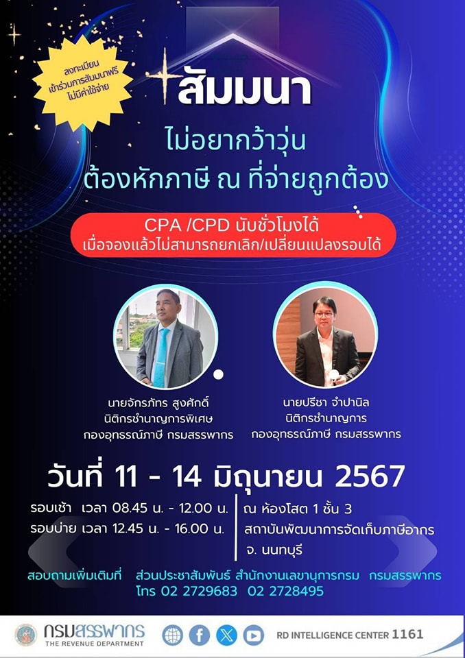 กรมสรรพากร เชิญร่วมฟังสัมมนา ฟรี เรื่อง “ไม่อยากว้าวุ่น ต้องหักภาษี ณ ที่จ่ายถูกต้อง” วันที่ 11 – 14 มิ.ย. 67