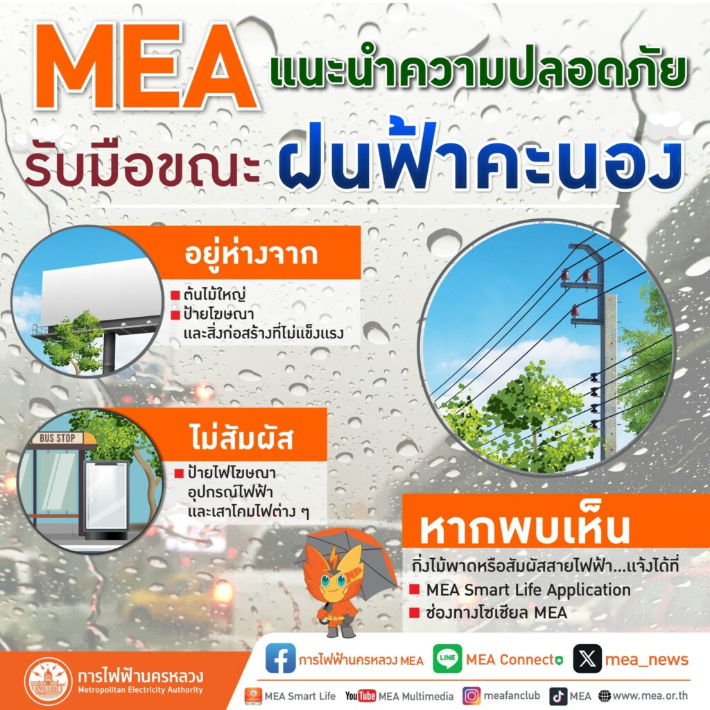 การไฟฟ้านครหลวง แนะนำความปลอดภัยรับมือขณะฝนฟ้าคะนอง มีดังนี้ อยู่ห่างจาก ต้นไม้ใหญ่ป้ายโฆษณา และสิ่งก่อสร้างที่ไม่แข็งแรง ไม่สัมผัส ป้ายไฟโฆษณาอุปกรณ์ไฟฟ้า และเสาโคมไฟต่าง ๆ หากพบเห็น กิ่งไม้พาด หรือสัมผัสสายไฟฟ้า แจ้งได้ที่ MEA Smart Life Application