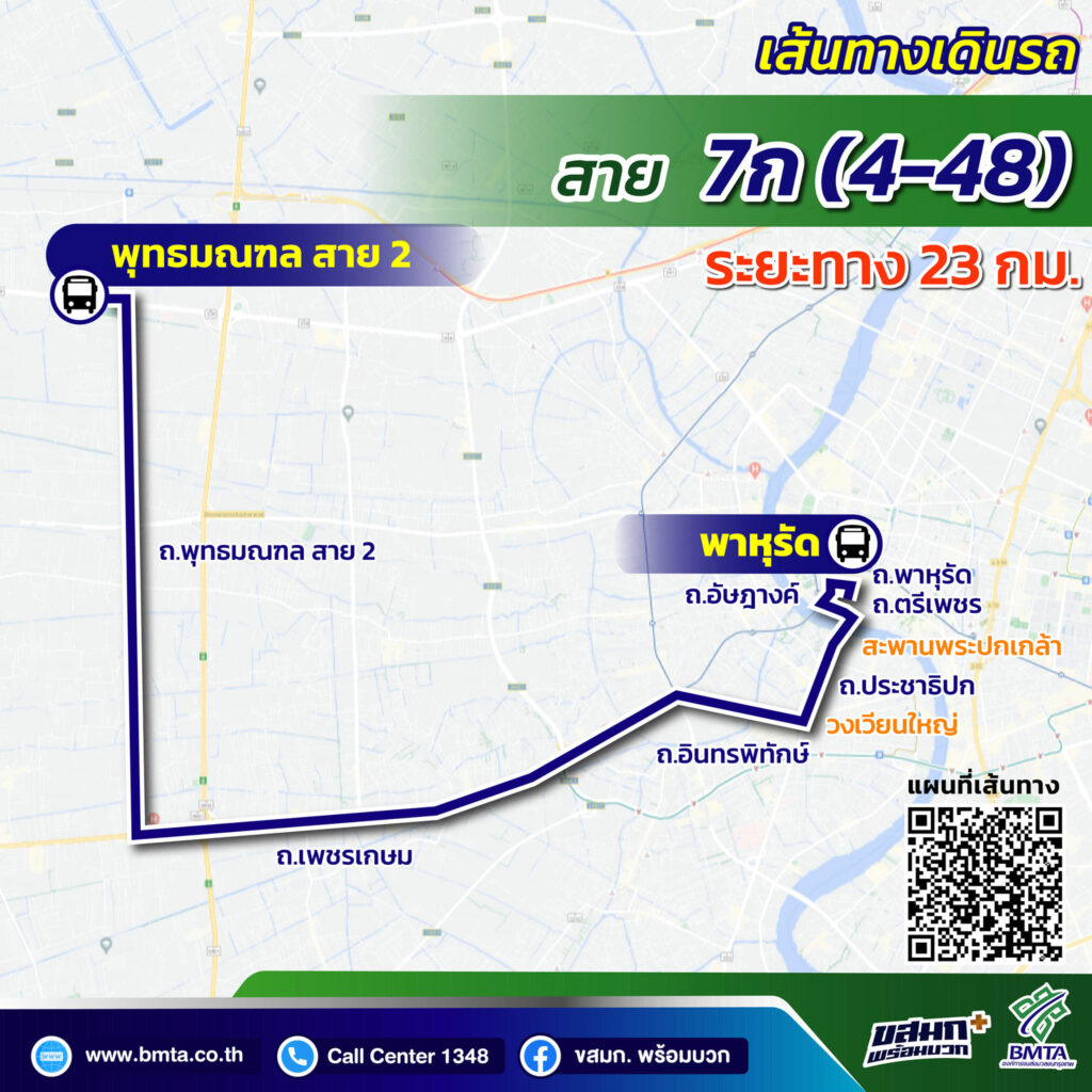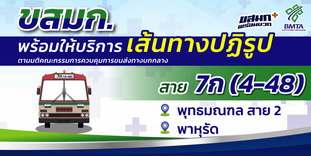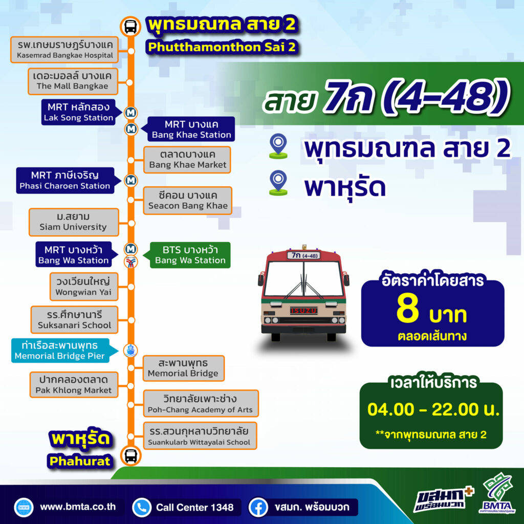 องค์การขนส่งมวลชนกรุงเทพ พร้อมให้บริการเส้นทางปฏิรูป สาย 7ก (4-48) พุทธมณฑลสาย 2 – พาหุรัด เวลาให้บริการ 04.00 – 22.00 น. (จากท่าต้นทาง) อัตราค่าโดยสาร 8 บาท (ตลอดเส้นทาง)