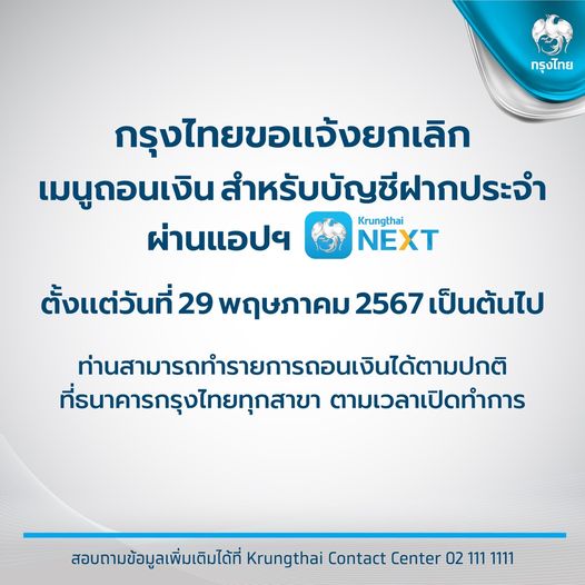 ธนาคารกรุงไทย แจ้งยกเลิกเมนูถอนเงินสำหรับบัญชีเงินฝากประจำ ผ่านแอปฯ Krungthai NEXT ตั้งแต่วันที่ 29 พฤษภาคม 2567 เป็นต้นไป สามารถทำรายการถอนเงินได้ที่ ธนาคารกรุงไทยทุกสาขาตามเวลาเปิดทำการ