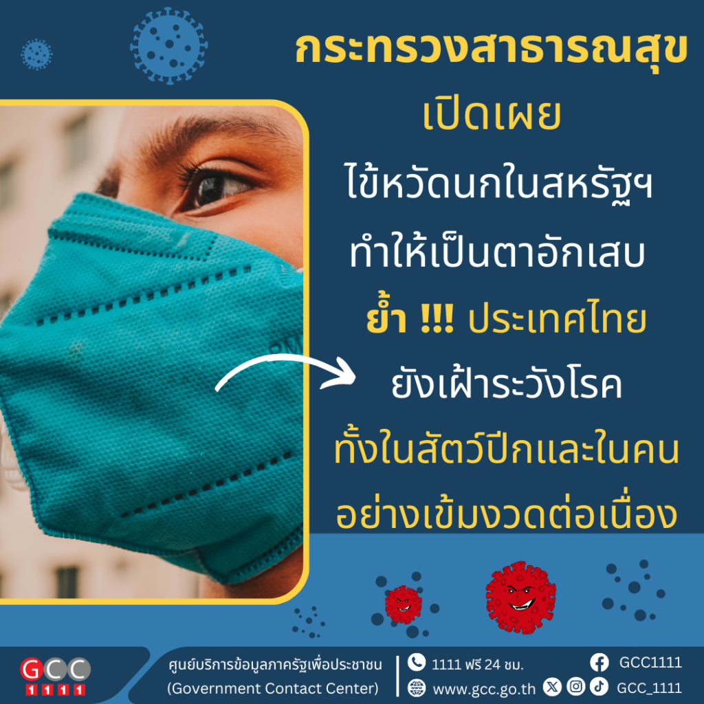กระทรวงสาธารณสุข เผย กรณีมีรายงานพบผู้ติดเชื้อไวรัสไข้หวัดนก H5N1 จำนวน 2 ราย ในสหรัฐฯ อาการไม่รุนแรง มีแค่ตาแดงอักเสบ ไม่มีอาการทางเดินหายใจ คาดติดเชื้อจากการสัมผัสสารคัดหลั่งของโคนมป่วยในฟาร์ม