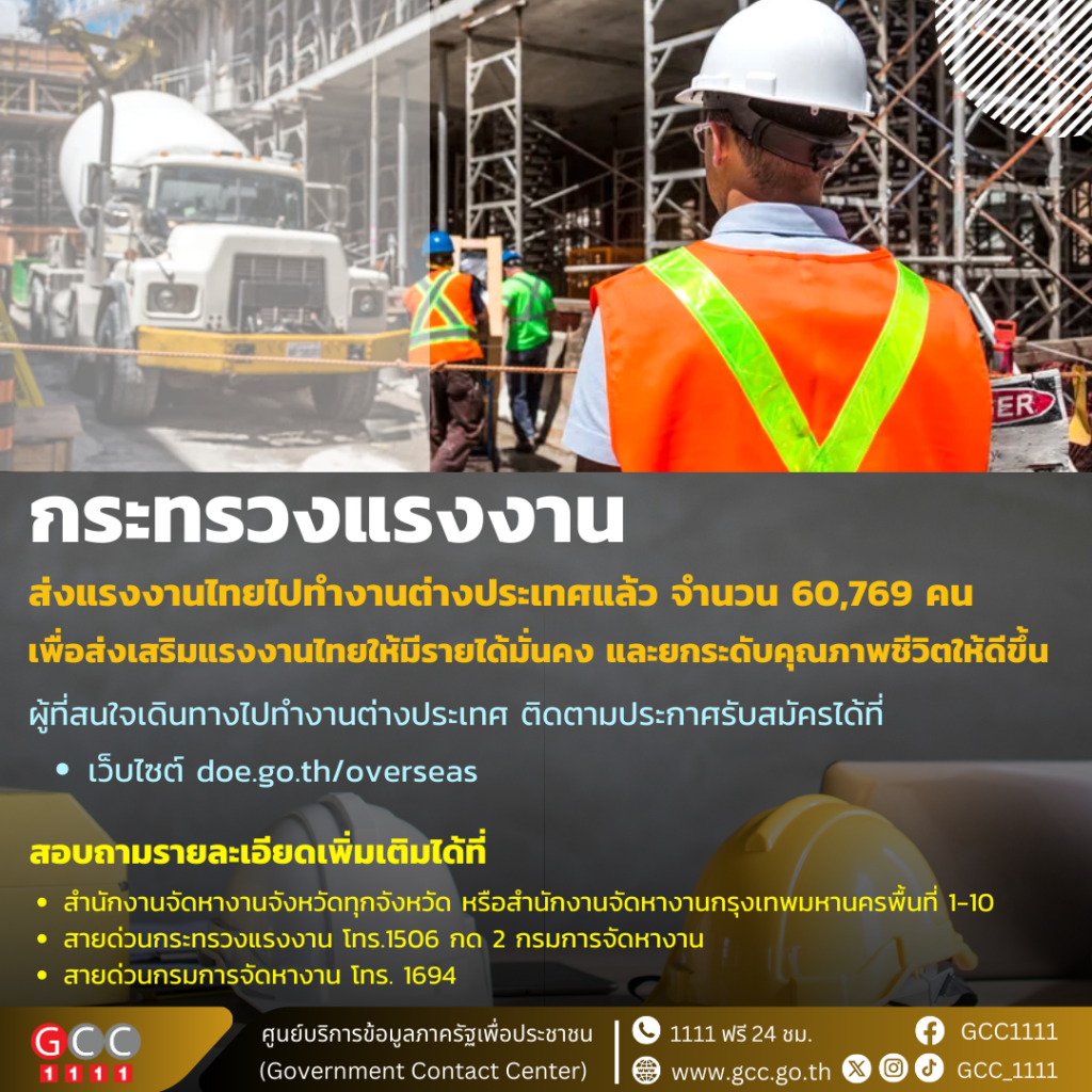 รัฐบาล เปิดเผยผลสำเร็จ คืบหน้าส่งแรงงานไทยไปทำงานต่างประเทศแล้ว กว่า 60,000 คน จากเป้าหมาย 100,000 คน เดินหน้าส่งแรงงานไทยไปทำงานต่างประเทศ เพื่อส่งเสริมแรงงานไทยให้มีรายได้มั่นคง และยกระดับคุณภาพชีวิตให้ดีขึ้น