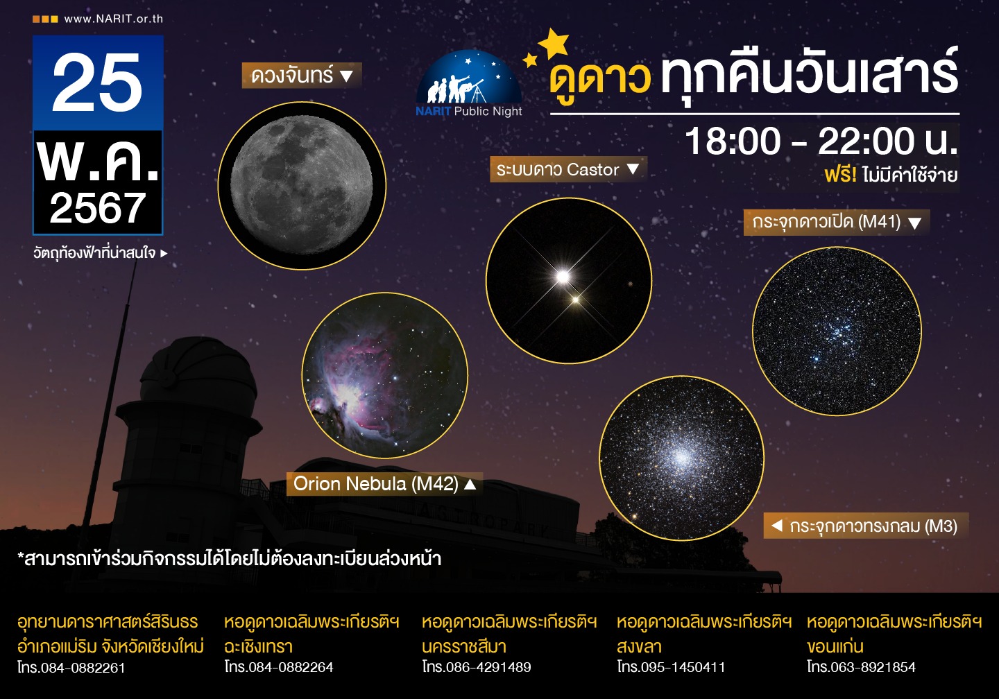 สถาบันวิจัยดาราศาสตร์แห่งชาติ ชวนร่วมกิจกรรม NARIT Public Night ฟรี วันที่ 25 พฤษภาคม 2567 เวลา 18.00 – 22.00 น. ณ หอดูดาวภูมิภาคสำหรับประชาชน 5 แห่ง