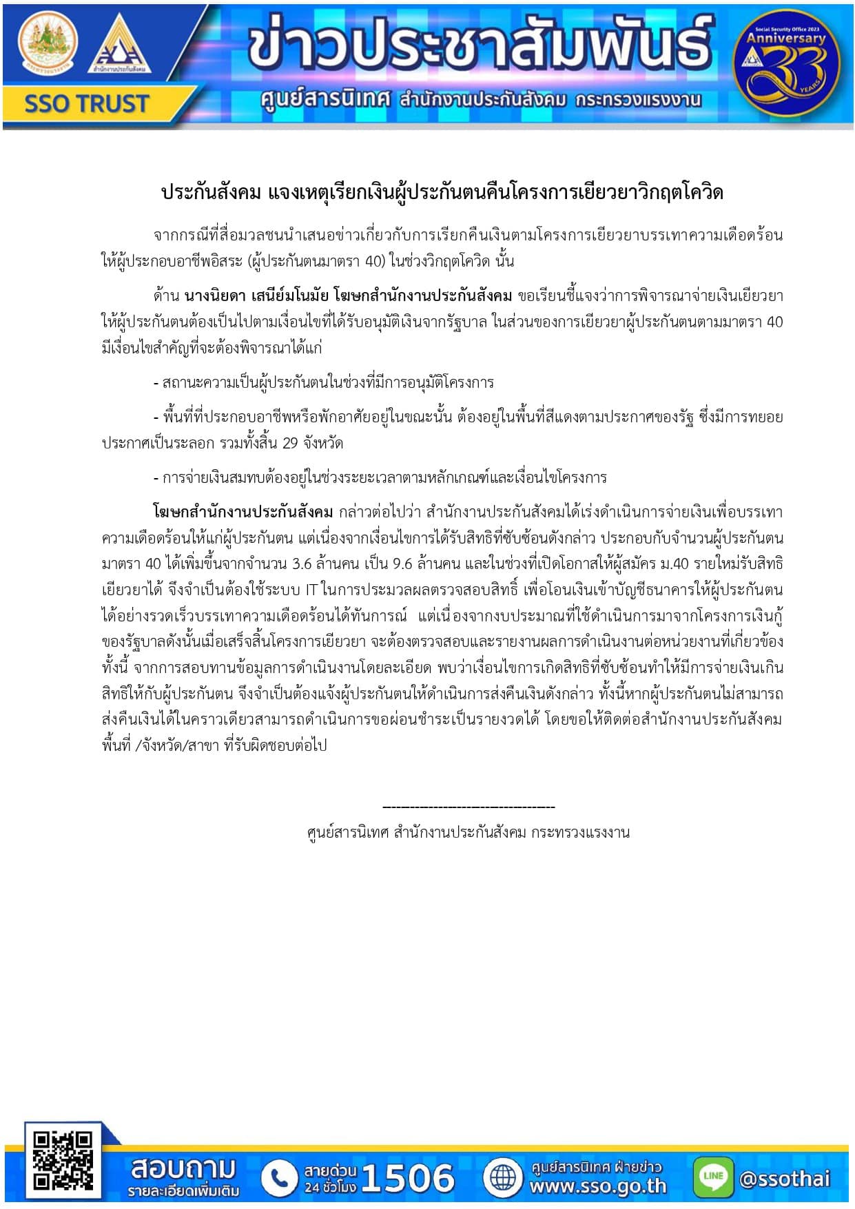 ประกันสังคม แจงเหตุเรียกเงินผู้ประกันตนคืนโครงการเยียวยาวิกฤตโควิด จากกรณีที่สื่อมวลชนนำเสนอข่าวเกี่ยวกับการเรียกคืนเงินตามโครงการเยียวยาบรรเทาความเดือดร้อนให้ผู้ประกอบอาชีพอิสระ (ผู้ประกันตนมาตรา 40) ในช่วงวิกฤตโควิด นั้น
