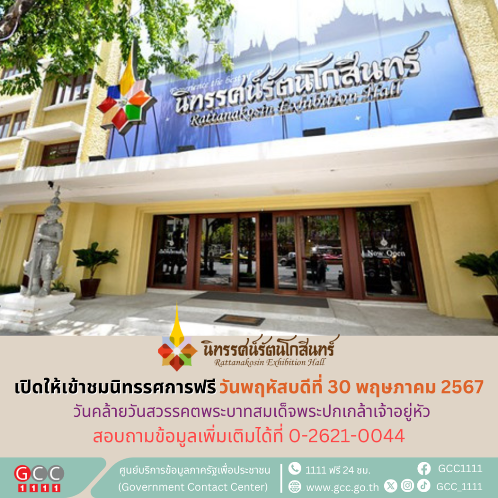 นิทรรศน์รัตนโกสินทร์ เปิดให้เข้าชมนิทรรศการฟรี วันคล้ายวันสวรรคตพระบาทสมเด็จพระปกเกล้าเจ้าอยู่หัว วันพฤหัสบดีที่ 30 พฤษภาคม 2567 สอบถามข้อมูลเพิ่มเติมได้ที่ หมายเลขโทรศัพท์ 0-2621-0044
