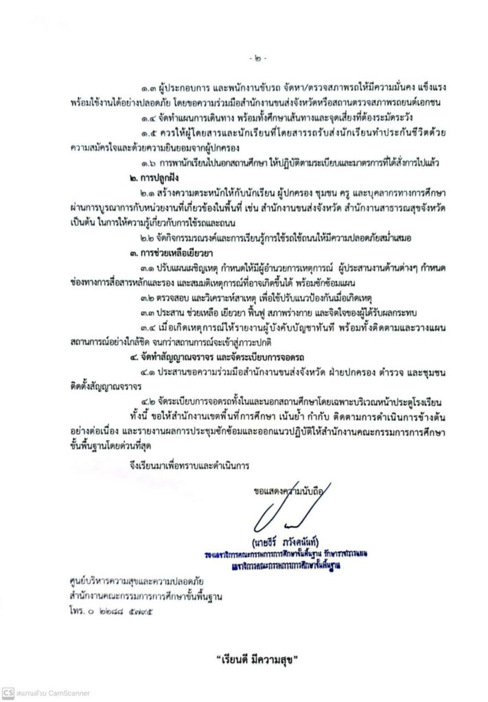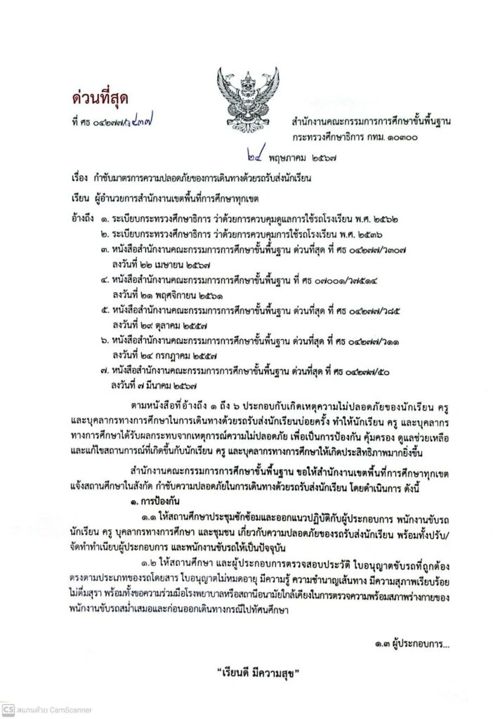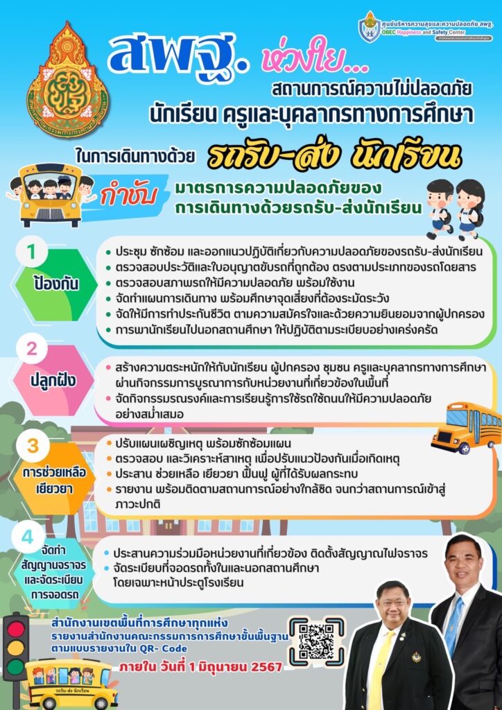สำนักงานคณะกรรมการการศึกษาขั้นพื้นฐาน กำชับมาตรการความปลอดภัยของ การเดินทางด้วยรถรับ-ส่งนักเรียน โดยเน้น 4 ด้าน คือ ป้องกัน ปลูกฝัง ช่วยเหลือเยียวยา และจัดทำสัญญาณจราจร และจัดระเบียบการจอดรถ