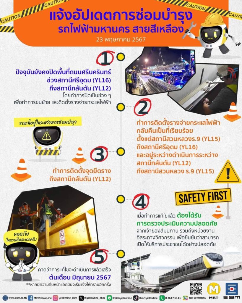 กรมการขนส่งทางราง แจ้งอัปเดตการซ่อมบำรุงรถไฟฟ้ามหานคร สายสีเหลือง โดยมีรายละเอียด ดังนี้