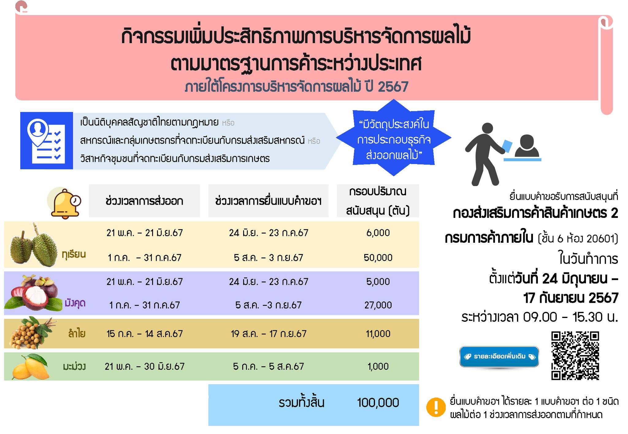 กรมการค้าภายใน จัดกิจกรรมเพิ่มประสิทธิภาพการบริหารจัดการผลไม้ ตามมาตรฐานการค้าระหว่างประเทศ ภายใต้โครงการบริหารจัดการผลไม้ ปี 2567 สนับสนุนค่าบริหารจัดการในการรวบรวมรับซื้อผลไม้คุณภาพตามมาตรฐานการค้าระหว่างประเทศ ในอัตรากิโลกรัมละ 4 บาท (ไม่เกิน 100,000 ตัน) และสนับสนุนค่าบริหารจัดการในการรวบรวมรับซื้อผลไม้คุณภาพตามมาตรฐานการค้าระหว่างประเทศ ต่อปริมาณผลไม้ที่รับซื้อส่งออก ในอัตราส่วน 1 : 2 ทั้งนี้ สามารถยื่นคำขอรับการสนับสนุน ในวันที่ 24 มิถุนายน 2567 – 17 กันยายน 2567 (ในเวลาทำการ ระหว่างเวลา 9.00 – 15.30 น.) ได้ที่ กองส่งเสริมการค้าสินค้าเกษตร 2 กรมการค้าภายใน