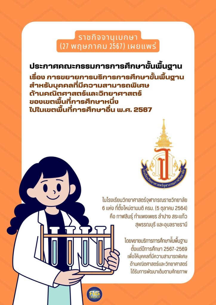 ราชกิจจานุเบกษา (27 พฤษภาคม 2567) เผยแพร่ประกาศคณะกรรมการการศึกษาขั้นพื้นฐาน สั่ง ณ วันที่ 13 พฤษภาคม พ.ศ. 2567 เรื่อง การขยายการบริการการศึกษาขั้นพื้นฐานสำหรับบุคคลที่มีความสามารถพิเศษด้านคณิตศาสตร์และวิทยาศาสตร์ของเขตพื้นที่การศึกษาหนึ่งไปในเขตพื้นที่การศึกษาอื่น พ.ศ. 2567