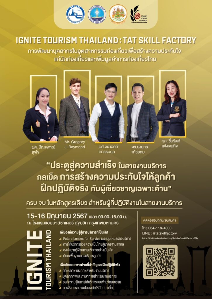 การท่องเที่ยวแห่งประเทศไทย ขอเชิญร่วมงาน Ignite Tourism Thailand: TAT Skill Factory การพัฒนาบุคลากรในอุตสาหกรรมท่องเที่ยวเพื่อสร้างความประทับใจ แก่นักท่องเที่ยวและเพิ่มมูลค่าการท่องเที่ยวไทย วันที่ 15-16 มิถุนายน 2567 เวลา 09.00 – 16.00 น. ณ โรงแรมแอมบาสซาเดอร์ สุขุมวิท กรุงเทพมหานคร