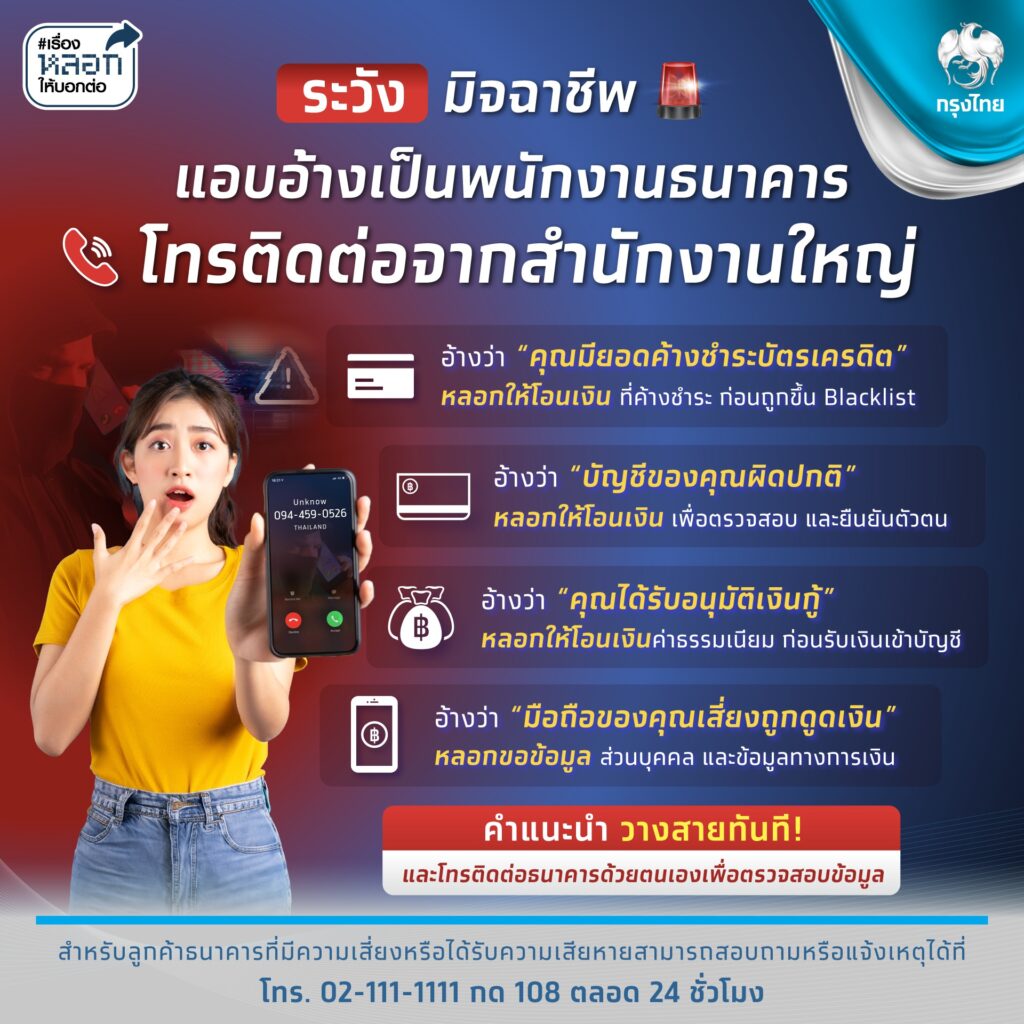 ธนาคารกรุงไทย แจ้งระวังมิจฉาชีพแอบอ้างเป็นพนักงานธนาคาร โทรติดต่อจากสำนักงานใหญ่