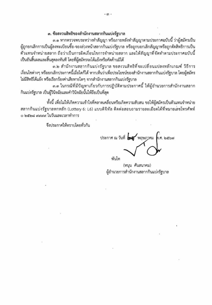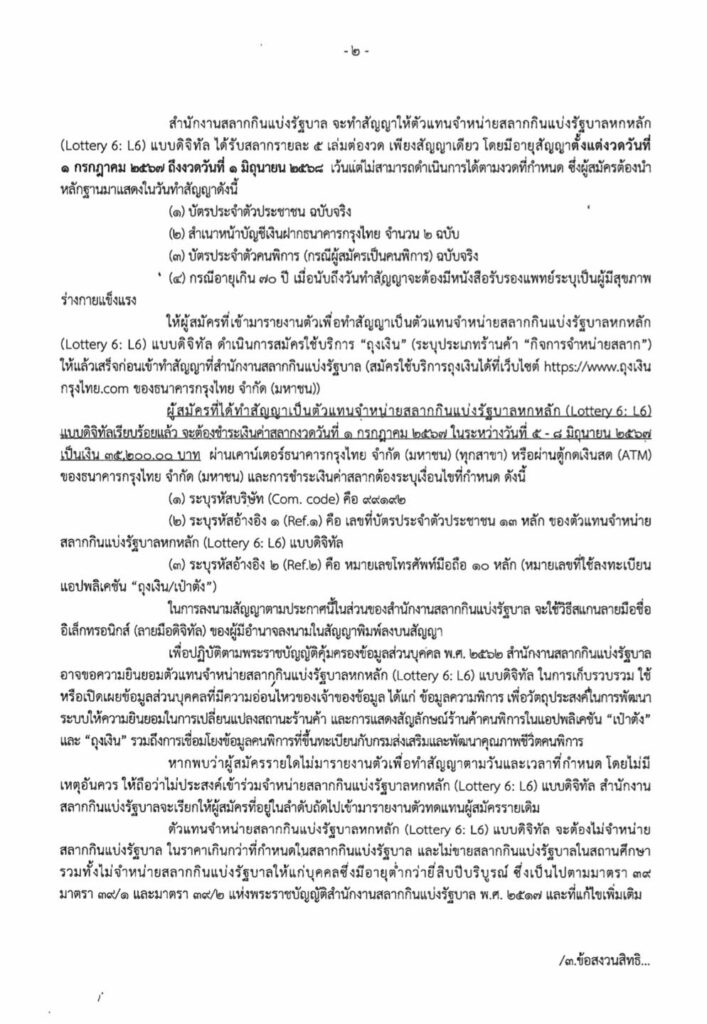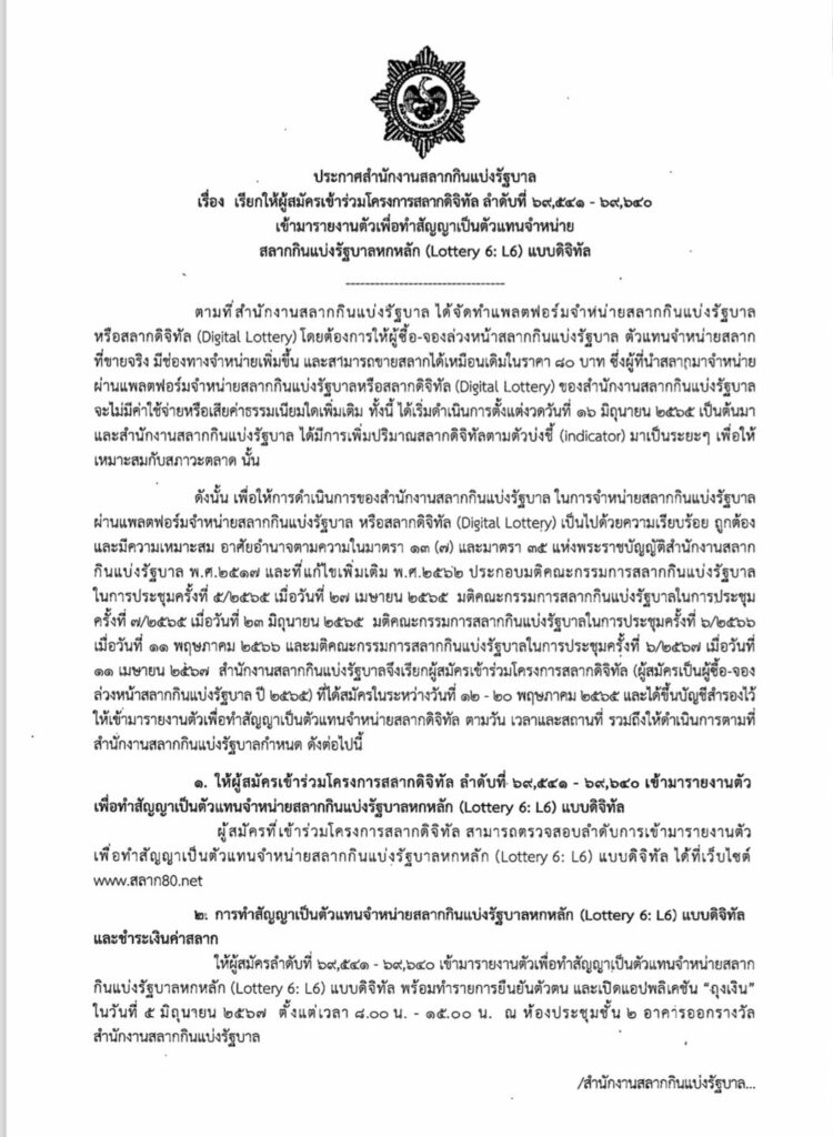 สำนักงานสลากกินแบ่งรัฐบาล เปิดเรียกผู้สมัครเข้าร่วมโครงการสลากดิจิทัล ลำดับที่ 69,541-69,640 เข้ามารายงานตัวเพื่อทำสัญญาเป็นตัวแทนจำหน่ายสลากกินแบ่งรัฐบาลหกหลัก (Lottery 6: L6) แบบดิจิทัล ในวันที่ 5 มิถุนายน 2567 ณ ห้องประชุม ชั้น 2 อาคารออกรางวัล สำนักงานสลากกินแบ่งรัฐบาล