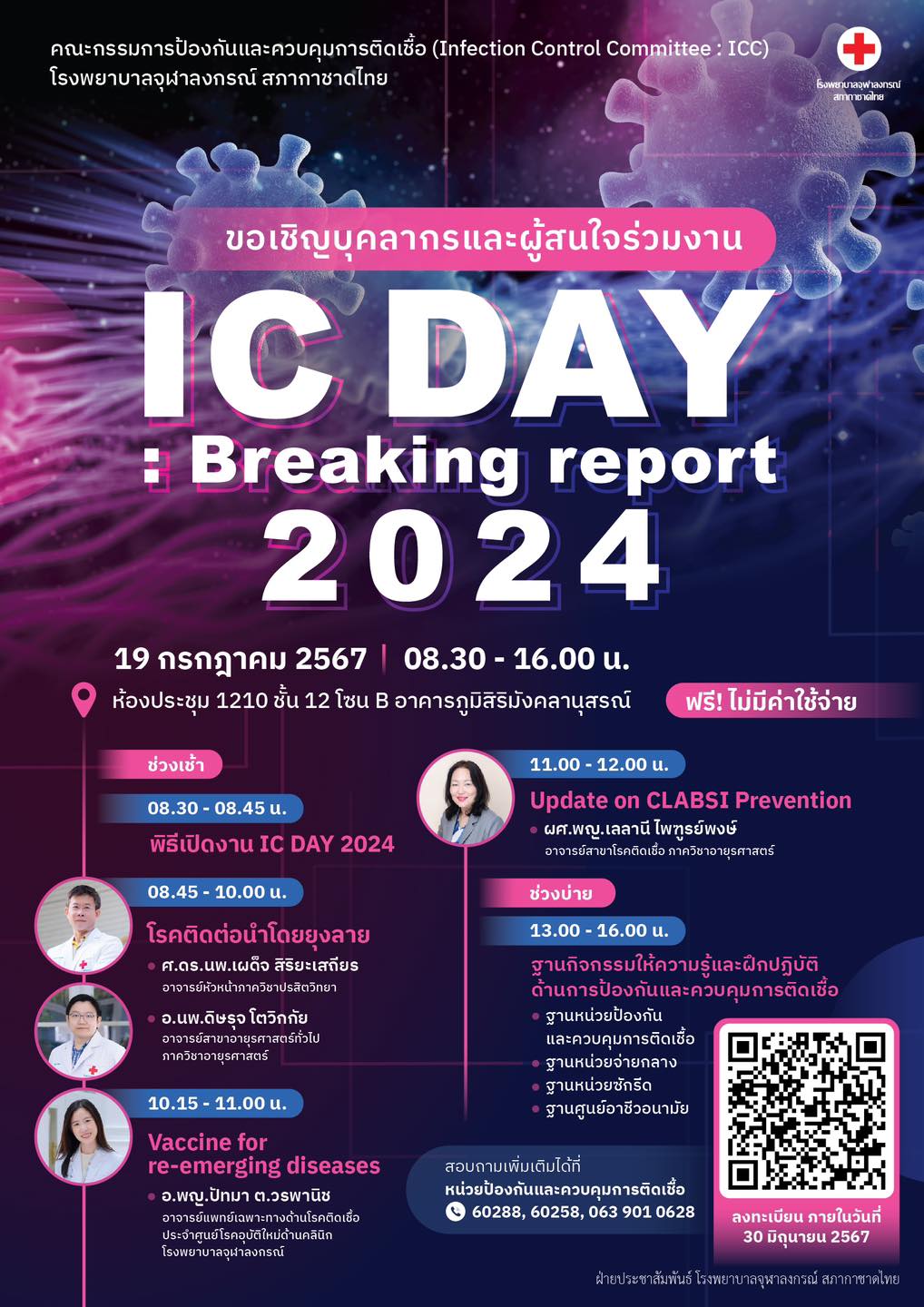 คณะกรรมการป้องกันและควบคุมการติดเชื้อ โรงพยาบาลจุฬาลงกรณ์ สภากาชาดไทย ขอเชิญบุคลากรและผู้สนใจร่วมงาน IC DAY : Breaking report 2024
