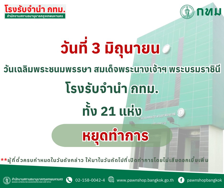โรงรับจำนำของกรุงเทพมหานคร สถานธนานุบาลกรุงเทพมหานคร 21 แห่ง ประกาศหยุด วันที่ 3 มิถุนายน 2567 เนื่องในวันเฉลิมพระชนมพรรษาสมเด็จพระนางเจ้าฯ พระบรมราชินี ผู้ที่ตั๋วรับจำนำครบกำหนดส่งดอกเบี้ยหรือไถ่ถอน ตรงกับวันเสาร์-อาทิตย์หรือวันหยุดนักขัตฤกษ์ ให้มาในวันที่เปิดทำการวันแรก โดยไม่คิดดอกเบี้ยเพิ่ม สอบถามข้อมูลเพิ่มเติมได้ที่ หมายเลขโทรศัพท์ 02-158-0042-4 เวลา 08.00 – 16.00 น. (ตามวันเวลาราชการ)