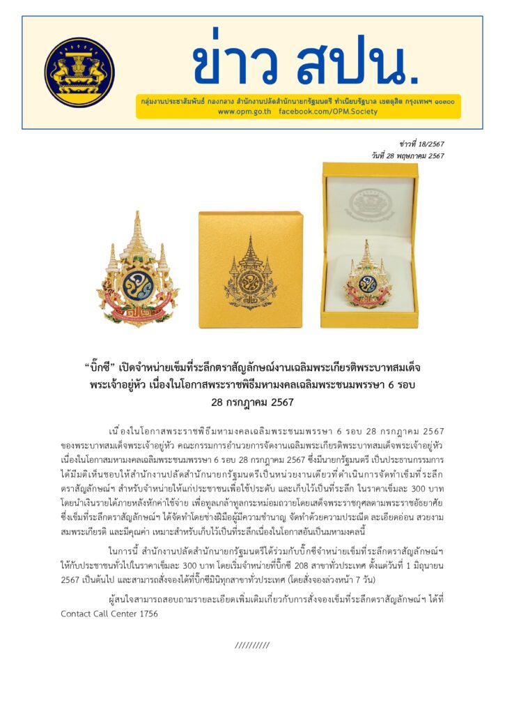 สำนักงานปลัดสำนักนายกรัฐมนตรี ร่วมกับ บิ๊กซี เปิดจำหน่ายเข็มที่ระลึกตราสัญลักษณ์งานเฉลิมพระเกียรติพระบาทสมเด็จพระเจ้าอยู่หัวเนื่องในโอกาสพระราชพิธีมหามงคลเฉลิมพระชนมพรรษา 6 รอบ 28 กรกฎาคม 2567 ตั้งแต่วันที่ 1 มิถุนายน 2567 เป็นต้นไป