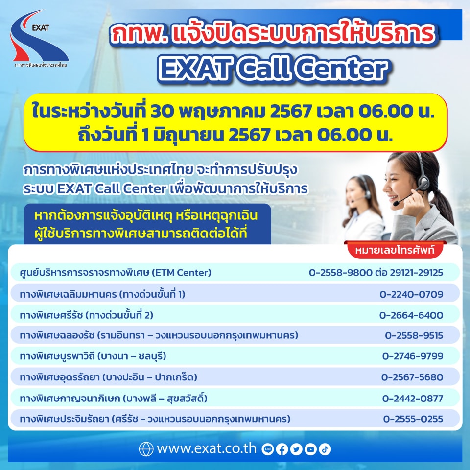 การทางพิเศษแห่งประเทศไทย มีความจำเป็นจะต้องปิดระบบการให้บริการติดต่อกับเจ้าหน้าที่ ของหมายเลขโทรศัพท์ 1543 (EXAT Call Center) เป็นการชั่วคราว ตั้งแต่วันที่ 30 พฤษภาคม 2567 เวลา 06.00 น. ถึง วันที่ 1 มิถุนายน 2567 เวลา 06.00 น. เพื่อการพัฒนาและปรับปรุงระบบการให้บริการ ทั้งนี้ ผู้ใช้บริการทางพิเศษสามารถแจ้งอุบัติเหตุ หรือแจ้งขอความช่วยเหลือ ผ่าน Application EXAT Portal ผ่านปุ่ม SOS ได้