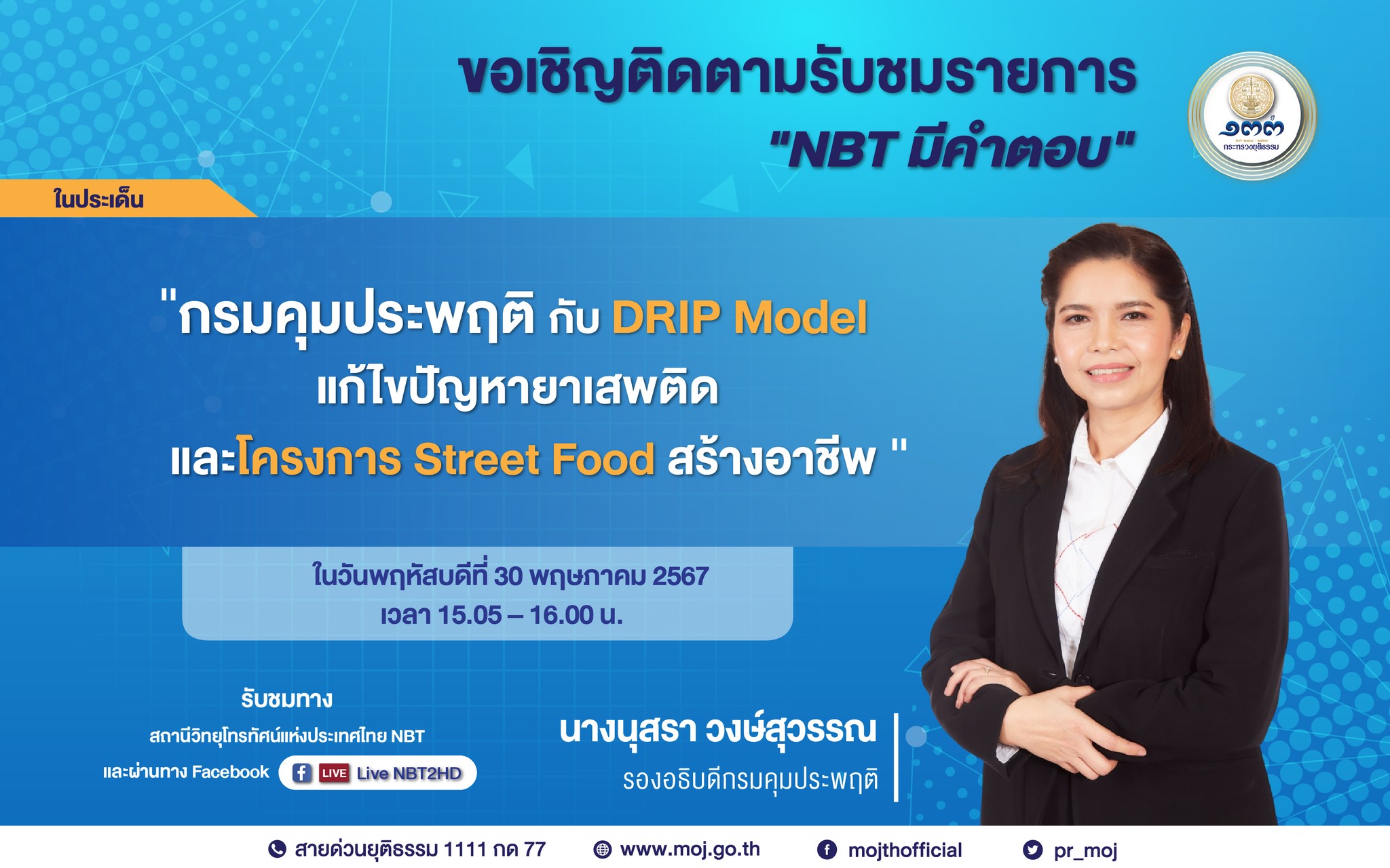 ขอเชิญรับชมรายการ “NBT มีคำตอบ” พบกับ นางนุสรา วงษ์สุวรรณ รองอธิบดีกรมคุมประพฤติ ให้สัมภาษณ์ในประเด็น “กรมคุมประพฤติกับ DRIP Model แก้ไขปัญหายาเสพติด และโครงการ Street Food สร้างอาชีพ”