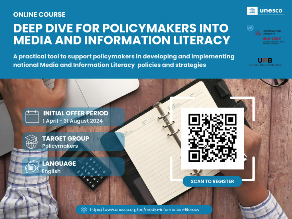 กระทรวงศึกษาธิการ ขอเชิญผู้มีหน้าที่จัดทำนโยบาย เจ้าหน้าที่ของรัฐ ผู้บริหารองค์กรภาครัฐและภาคเอกชน ร่วมลงทะเบียนเรียน หลักสูตรออนไลน์สำหรับผู้มีหน้าที่จัดทำนโยบายด้านการรู้เท่าทันสื่อและสารสนเทศ เพื่อมุ่งเน้นการเชื่อมโยงระหว่างการรู้เท่าทันสื่อและสารสนเทศ การพัฒนา และแนวทางการจัดทำนโยบายสาธารณะ โดยเรียนรู้ด้วยตนเอง บรรยายเป็นภาษาอังกฤษ ตั้งแต่บัดนี้ – 31 สิงหาคม 2567 สามารถลงทะเบียนตาม QR Code รายละเอียดเพิ่มเติม สำนักความสัมพันธ์ต่างประเทศ สป.หมายเลขโทรศัพท์ 0 2281 0565 ต่อ 114