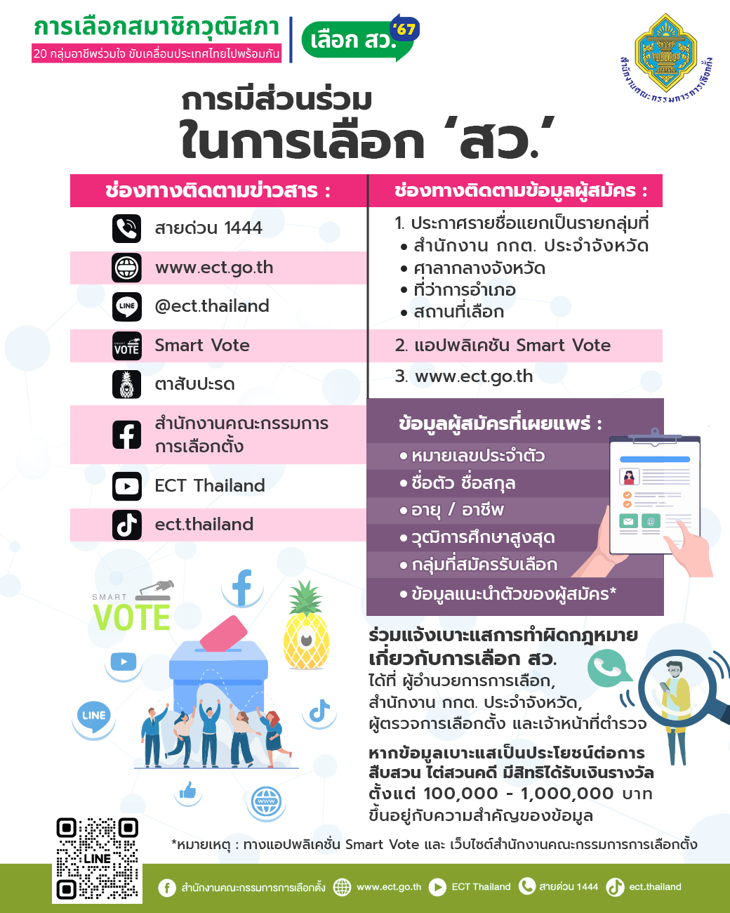 ร่วมแจ้งเบาะแสการทําผิดกฎหมาย เกี่ยวกับการเลือก สว. ได้ที่ ผู้อํานวยการการเลือก, สํานักงาน กกต. ประจําจังหวัด, ผู้ตรวจการเลือกตั้ง และเจ้าหน้าที่ตํารวจ