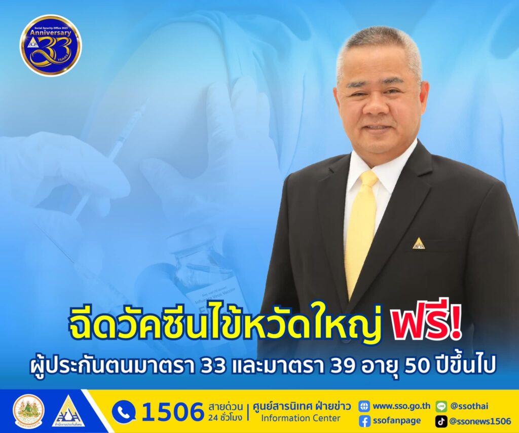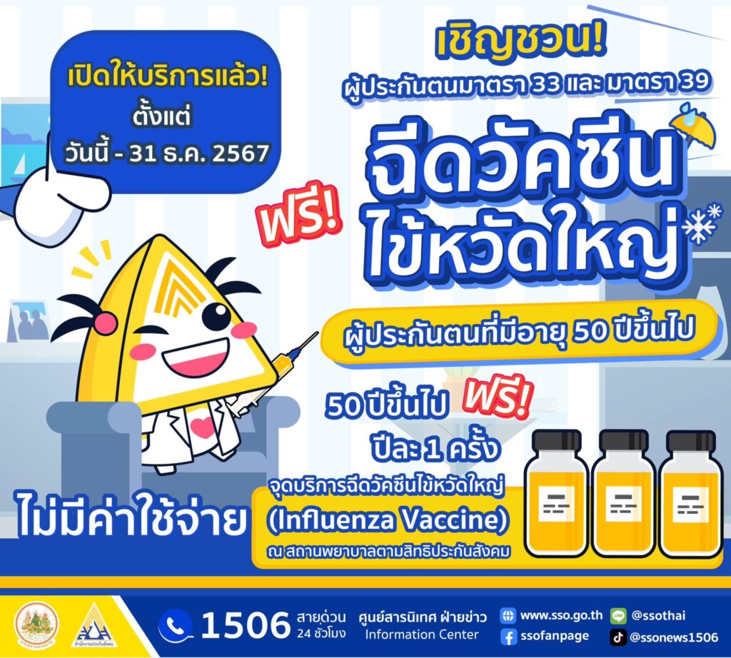 สำนักงานประกันสังคม จัดให้บริการฉีดวัคซีนไข้หวัดใหญ่ (Influenza Vaccine) ให้กับผู้ประกันตน 33 และผู้ประกันตนมาตรา 39 ที่มีอายุ 50 ปีขึ้นไป ฉีดวัคซีนไข้หวัดใหญ่ ฟรี ภายในเดือนธันวาคม 2567 ผู้ประกันตนสามารถเข้ารับบริการฉีดวัคซีนไข้หวัดใหญ่ได้ ณ สถานพยาบาลที่สำนักงานประกันสังคมกำหนด ผู้ประกันตนมาตรา 33 และผู้ประกันตนมาตรา 39 ที่มีอายุตั้งแต่ 50 ปีขึ้นไป ประสงค์จะฉีดวัคซีนไข้หวัดใหญ่ แนะนำให้ติดต่อนัดหมายการฉีดวัคซีนกับสถานพยาบาลตามสิทธิของท่านก่อนเข้ารับบริการ ทั้งนี้ หากผู้ประกันตนมีโรคประจำตัวหรือ มีประวัติการแพ้วัคซีน ควรปรึกษาแพทย์ก่อนการเข้ารับบริการ ติดต่อสอบถามข้อมูลเพิ่มเติมได้ที่ โทรศัพท์สายด่วน 1506 ให้บริการทุกวันตลอด 24 ชั่วโมง