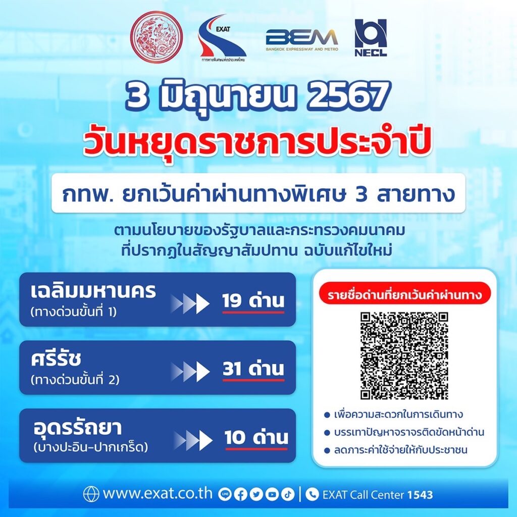 การทางพิเศษแห่งประเทศไทย ยกเว้นค่าผ่านทาง 3 สายทาง วันที่ 3 มิถุนายน 2567