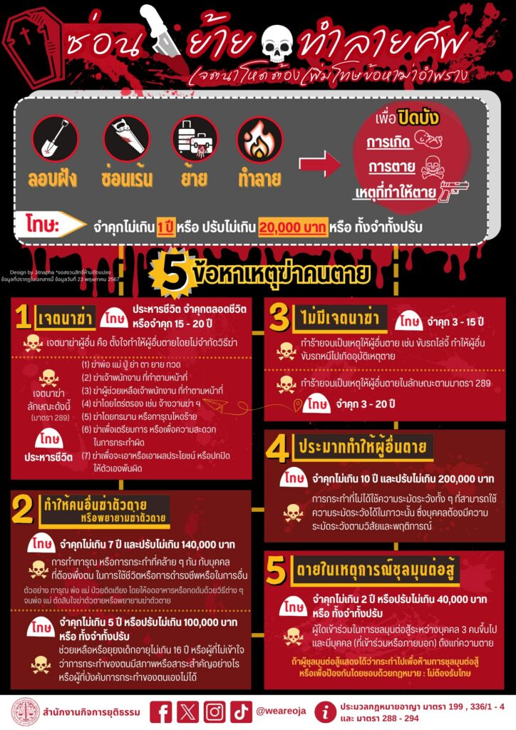 - สำนักงานกิจการยุติธรรม เปิดเผยกฎหมายน่ารู้ ซ่อน ย้าย ทำลายศพ เจตนาโหดต้องเพิ่มข้อหาฆ่าอำพราง