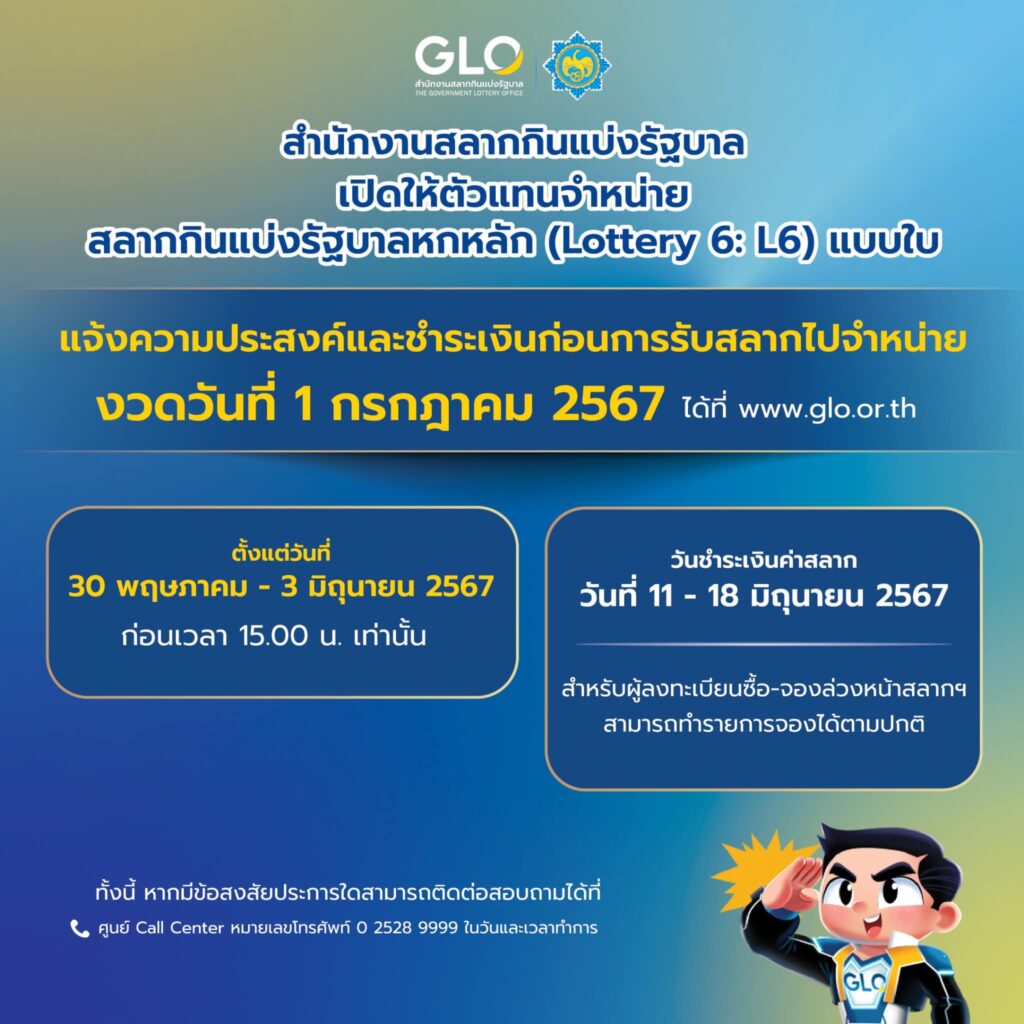 สำนักงานสลากกินแบ่งรัฐบาล เปิดให้ตัวแทนจำหน่ายสลากกินแบ่งรัฐบาลหกหลัก (Lottery 6 : L6) แจ้งความประสงค์และชำระเงินก่อนการรับสลากไปจำหน่ายงวดวันที่ 1 กรกฎาคม 2567 ได้ที่ https://services.glo.or.th/…/ind…/pages/req_sale_lottery โดยแจ้งความประสงค์ตั้งแต่วันที่ 30 พฤษภาคม – 3 มิถุนายน 2567 ก่อนเวลา 15.00 น. เท่านั้นส่วนวันชำระเงินค่าสลาก วันที่ 11 – 18 มิถุนายน 2567 สำหรับผู้ลงทะเบียนซื้อ – จองล่วงหน้าสลากฯ สามารถทำรายการจองได้ตามปกติ หากมีข้อสงสัยสามารถติดต่อสอบถามได้ที่ ศูนย์ Call Center หมายเลขโทรศัพท์ 0 2528 9999 ในวันและเวลาทำการ