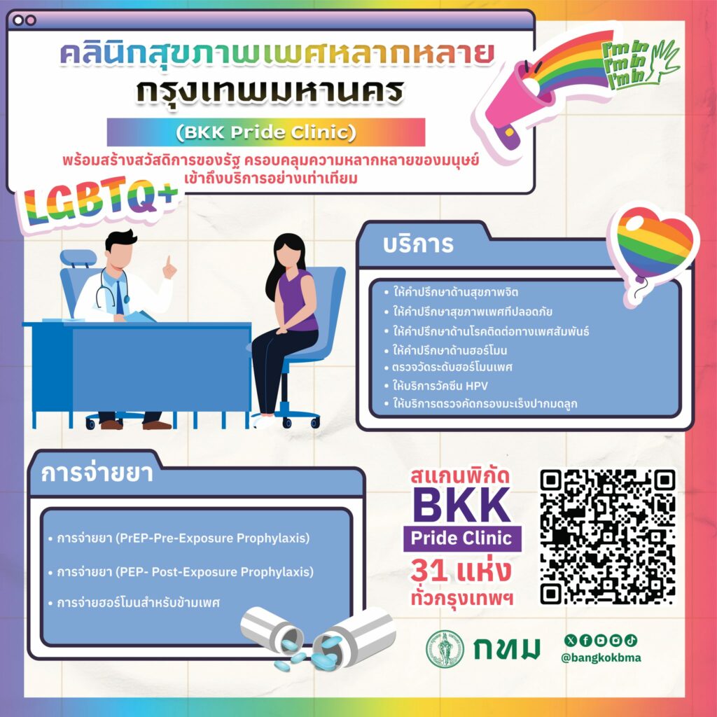 คลินิกให้บริการด้านสุขภาพสำหรับกลุ่ม LGBTQIA+ โดยเฉพาะ เข้าถึงบริการสุขภาพ อย่างเท่าเทียมกัน โดยไม่แบ่งแยกเพศ เข้ารับบริการได้แล้วที่โรงพยาบาลสังกัด กทม. 11 แห่ง และศูนย์บริการสาธารณสุข 20 แห่ง รวม 31 แห่งทั่วกรุง