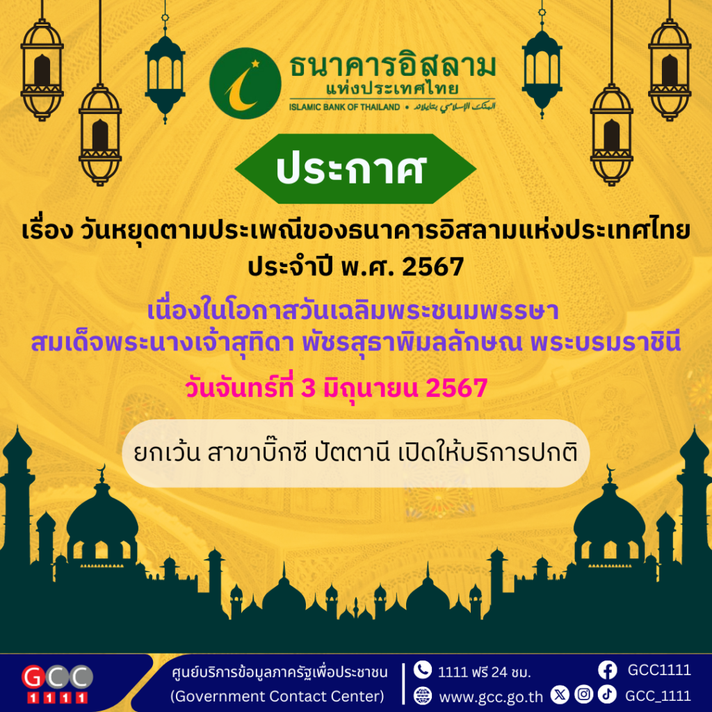 ธนาคารอิสลามแห่งประเทศไทย แจ้งประกาศ เรื่อง วันหยุดตามประเพณีของธนาคารอิสลามแห่งประเทศไทย ประจำปี พ.ศ. 2567 เนื่องในโอกาสวันเฉลิมพระชนมพรรษา สมเด็จพระนางเจ้าสุทิดา พัชรสุธาพิมลลักษณ พระบรมราชินี วันจันทร์ที่ 3 มิถุนายน 2567 ยกเว้น สาขาบิ๊กซี ปัตตานี เปิดให้บริการปกติ