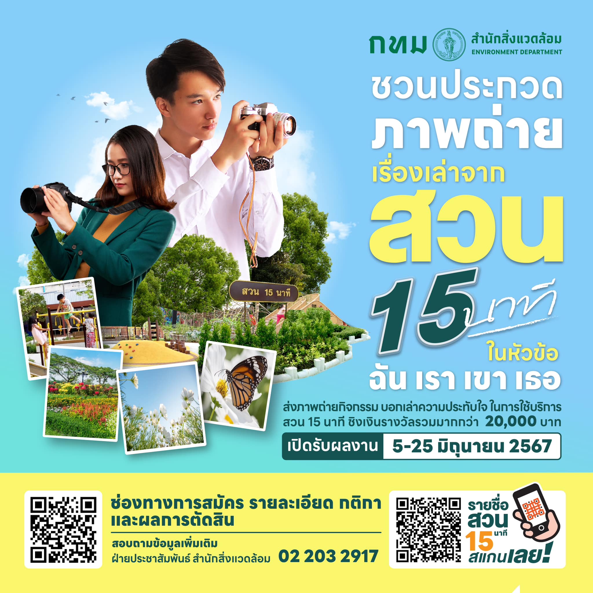 สำนักสิ่งแวดล้อม ชวนส่งผลงานภาพถ่ายเข้าร่วมประกวดภาพถ่าย “เรื่องเล่าจากสวน 15 นาที” ในหัวข้อ “ฉัน เรา เขา เธอ” ชิงเงินรางวัลรวม 24,000 บาท พร้อมเกียรติบัตรจากกรุงเทพมหานคร ส่งผลงานได้ระหว่างวันที่ 5 – 25 มิถุนายน 2567