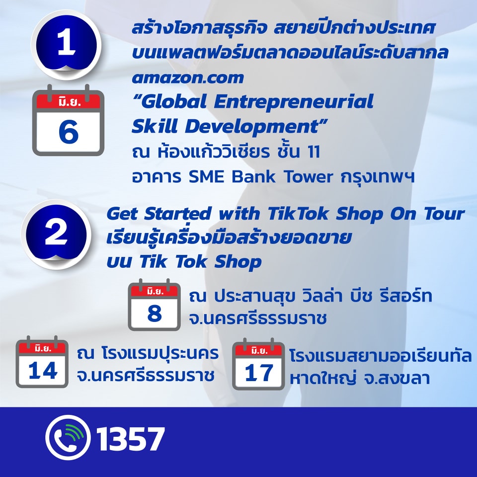 - ในงาน “มหกรรมรวมพลัง SMEs ไทย” ระหว่างวันที่ 19 – 23 มิถุนายน 2567 ณ ศูนย์การประชุมแห่งชาติสิริกิติ์ กรุงเทพมหานคร