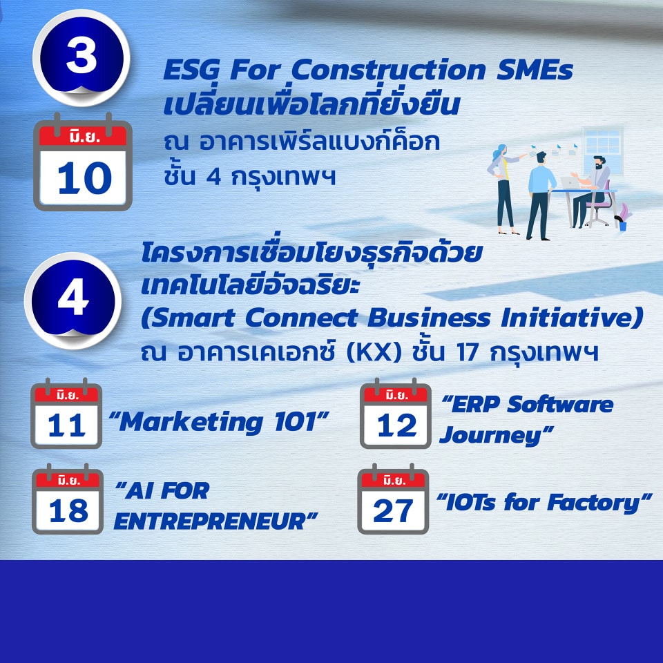 - โครงการเชื่อมโยงธุรกิจด้วยเทคโนโลยีอัจฉริยะ “Smart Connect Business Initiative” ส่งเสริมผู้ประกอบการก้าวสู่ธุรกิจยุคใหม่ จัดทั้งหมด 4 วัน ณ อาคารเคเอกซ์ (KX) ชั้น 17 กรุงเทพมหานคร ได้แก่
